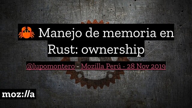 de memoria? • ¿Qué es manejo de memoria? • Estrategias de manejo de memoria Parte 3: Un ejemplo • Threads • Race conditions • Mutex • Message passing • Shared state Parte 2: Ownership en Rust • Reglas de ownership • Valores, variables y tipos • String • Referencias y borrowing • Scope • Ownership y funciones • Slices