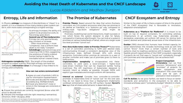 of disorderliness or “chaos” in a system, or it is a measure of how many states a given system can be in, with more states corresponding to a higher entropy. The First Law of Complexodynamics (Aaronson, 2011) Kolmogorov complexity (1963): The length of the smallest program to output a string. Thus high entropy can have low complexity. Information value of a message is thus linked to its entropy and complexity. 4. Ensure the symbols are correctly recognized (know what API struct to decode into) 5. Interpret the message with the right meaning (=semantics). (Shannon, 1948 + Burgess, 2013) *All information transmission in the end happens through physical particles one way or the other, so there is always room for error and distortion. **Kubernetes was not necessarily designed with Promise Theory in mind. We don’t know if Promise Theory had influence on the Kubernetes design. The Promise of Kubernetes Promise Theory: Based around the idea that actors (humans, controllers, etc.) of a system announce what they can promise to do (define an interface), in a “bottoms up” way, compared to military-style “top-down obligations” (that might be ambiguous). Promises, modelling real-world interactions, might succeed, or not, which forces the system designer to plan for failure, compared to it being an afterthought. You can look at a system’s promises at various scales/levels of detail, where at a larger scale low-level promises “cancel out”. How does Kubernetes relate to Promise Theory?** Kubernetes is a set of controllers promising to fulfill user desired state, communicating through a consistent declarative view of the infrastructure state, defined through APIs with strong semantics. Controllers either promise an outcome to a user or another controller and make use of promises given to them to fulfill actions. Implementation complexity is encapsulated into these controllers, to yield users a lower-entropic / higher-level state-driven interface that can be inspected (unlike Turing machines). The API machinery of Kubernetes designed to transmit intent as reliably as possible, through JSON with explicit type metadata and strong & uniform API semantics. Internal vs external: Consider how controller-to-controller promises in Kubernetes kind of “cancel out” for the end user, they do not need to know how a Deployment implements workload orchestration, only the API surface. Caveat: Hyrum’s law says that all observable behavior is depended upon. CNCF Ecosystem and Entropy Similar to the origin of life, is there a region of time in the growth of the CNCF ecosystem that is favourable to innovation, adaptation and adoption? Kubernetes as a “Platform for Platforms”: It is meant to be built on top of, beyond containers, for controlling arbitrary infrastructure in an uniform way. Kubernetes provides a declarative, extensible, yet uniform API server for storing both (users’) desired and (observed) actual state of the infrastructure. Dunbar (1992) showed that humans have limited capacity for social relationships: this includes technology tools as well. One cannot “know” more than a certain number of tools and patterns. (Just try reading a sentence with 5 clauses). This limits feasible growth opportunities of the CNCF ecosystem, especially if projects do not find ways to “cancel out” complexity through joint promises and interoperability. Can we achieve that? Call To Action: As we grow further, we need to focus on better standards and semantics in the ecosystem to be able to innovate and keep users’ “complexity budget” (Hockin) in check. Avoiding the Heat Death of Kubernetes and the CNCF Landscape Lucas Käldström and Madhav Jivrajani As entropy increases, the ability of a system to do productive work, its free energy goes down. Second Law of Thermodynamics: Entropy can only spontaneously stay constant or increase. Often more entropy => more “complexity”, but a uniform heat death is not really “complex”. Schrödinger explored entropy and meaning of life in 1944, suggesting the existence of highly-ordered human beings is paid for by inevitable human-created chaos. How can two actors communicate? 1. Agree on a set of symbols (=API) to use for information representation. 2. Encode and decode the message accurately (e.g. JSON/protobuf). 3. Ensure any distortion*, noise or errors in the message are corrected, or detected, Project Comparison Dimensions: Can we find common “dimensions” and “promises” of projects for easier comparison and evaluation? This could help users and be part of graduation level evaluation.