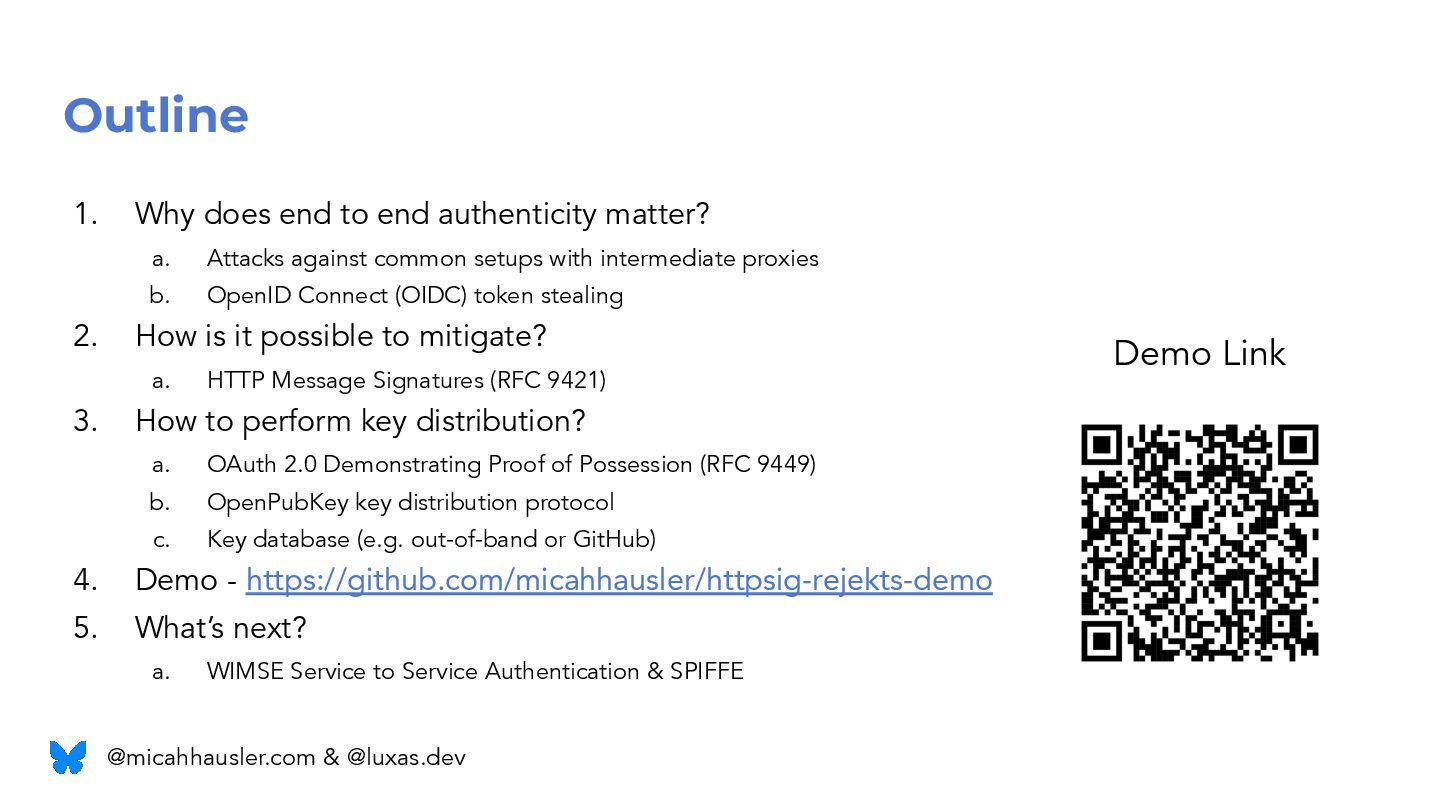 This talk introduces the audience to HTTP Message Signatures and demonstrates its security benefits to authentication in cloud native, microservice-oriented, systems. Further, we’ll cover how the use of smart caching and replication allows this protocol to scale to millions of requests per second, and how this could be integrated with SPIFFE.