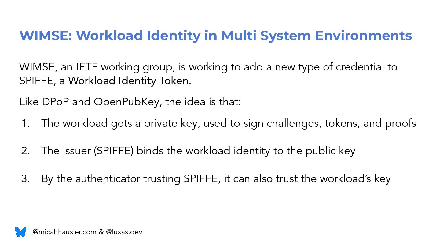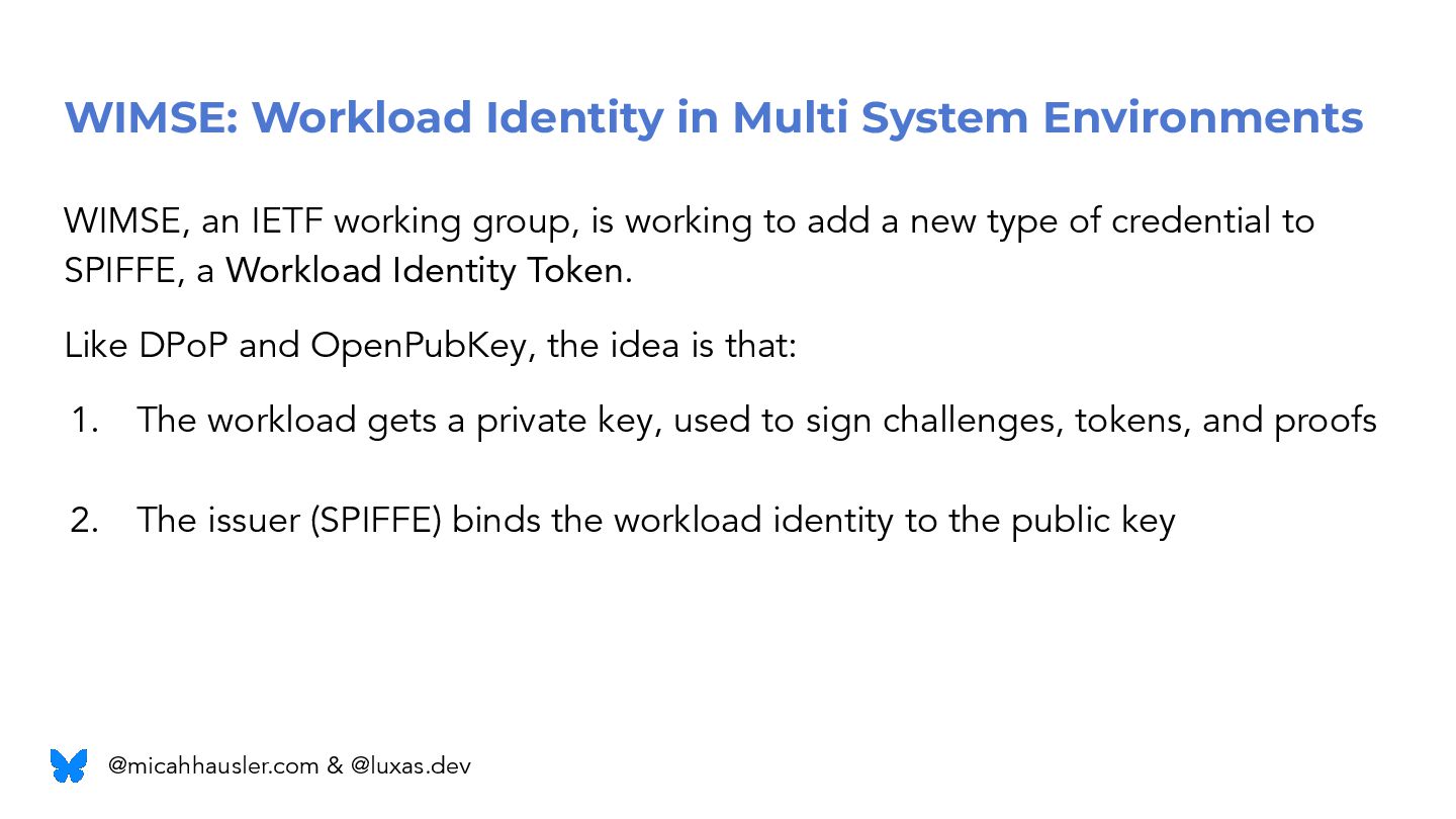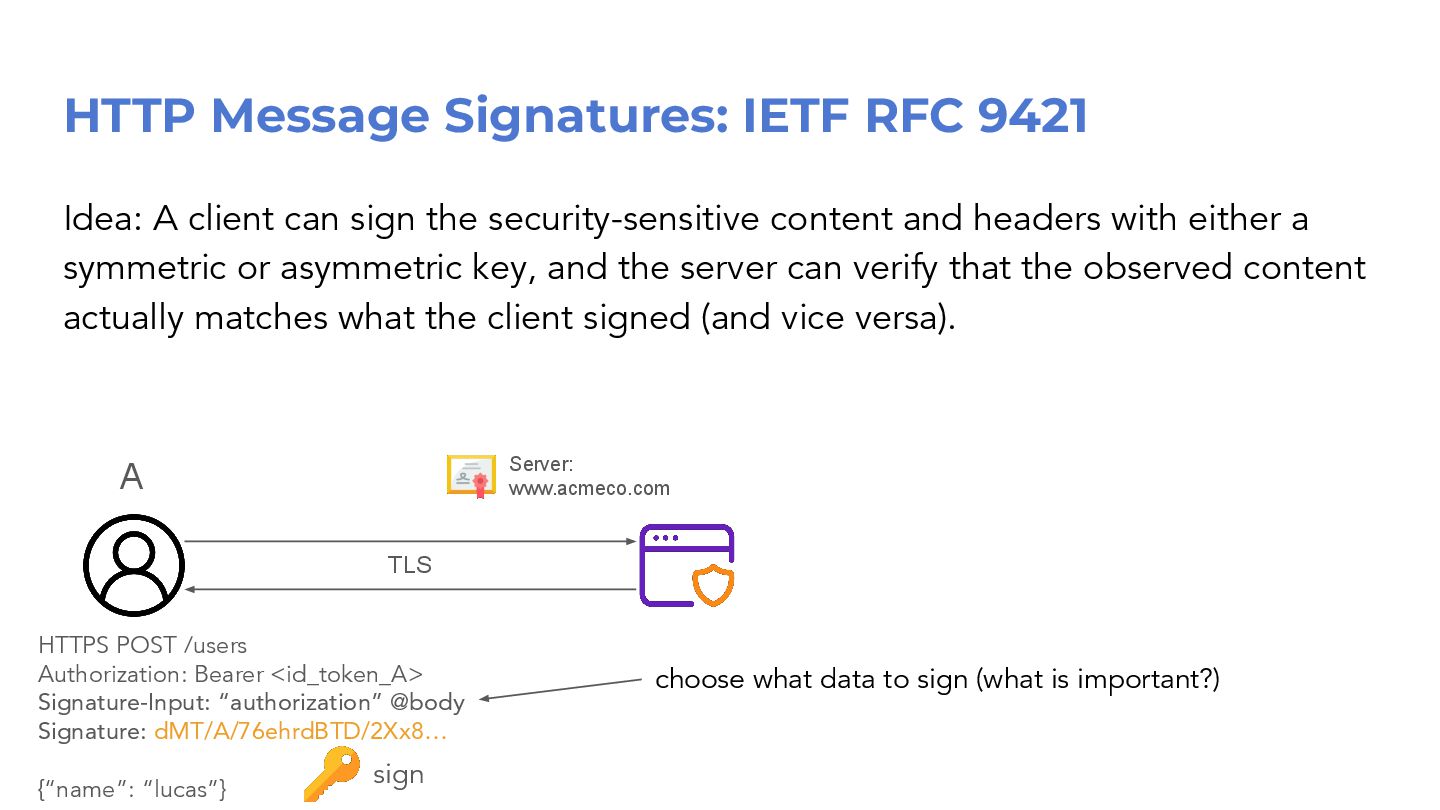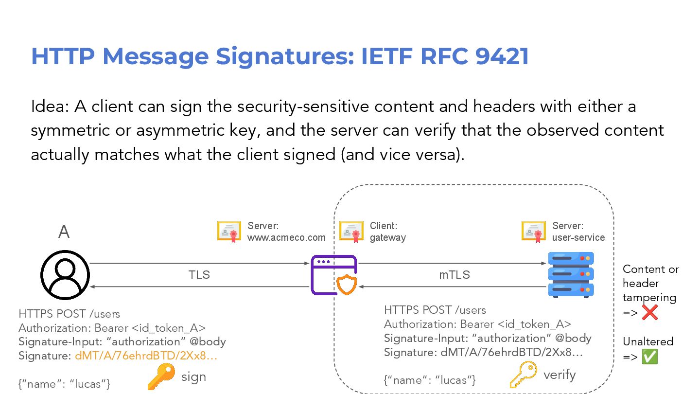 OpenID Connect (OIDC) and mutual TLS are popular authentication mechanisms used widely in cloud native environments, and commonly as a basis for workload identity in SPIFFE. However, OIDC tokens are prone to interception, replay, and forwarding attacks and are unable to guarantee end-to-end request authenticity. Mutual TLS solves those problems at the transport layer, but is rarely used in browsers, and seldom fully end-to-end in microservices-oriented systems. HTTP Message Signatures is a new IETF specification that aims to solve credential replay, forwarding and end-to-end integrity attacks, and be broadly deployable.