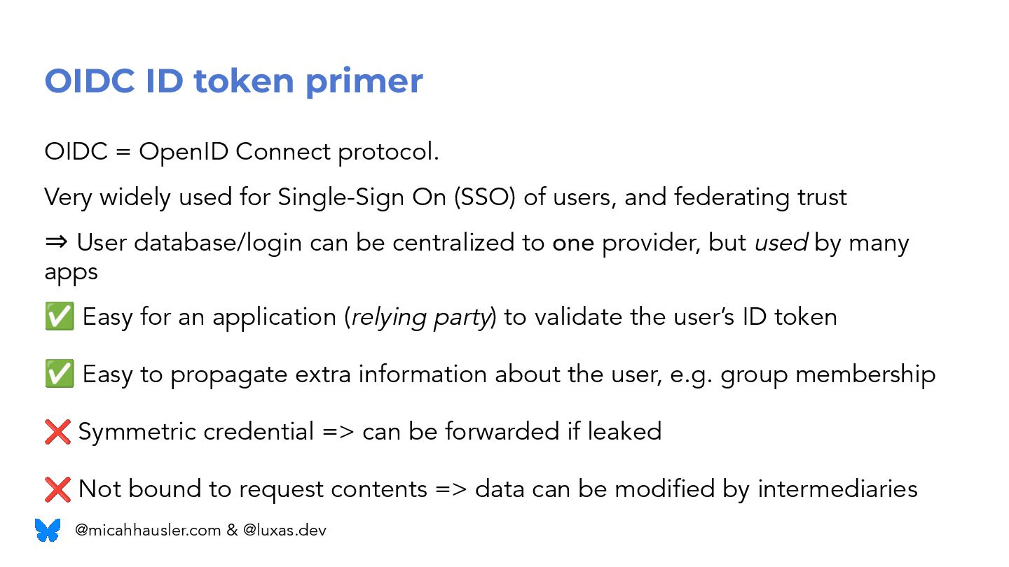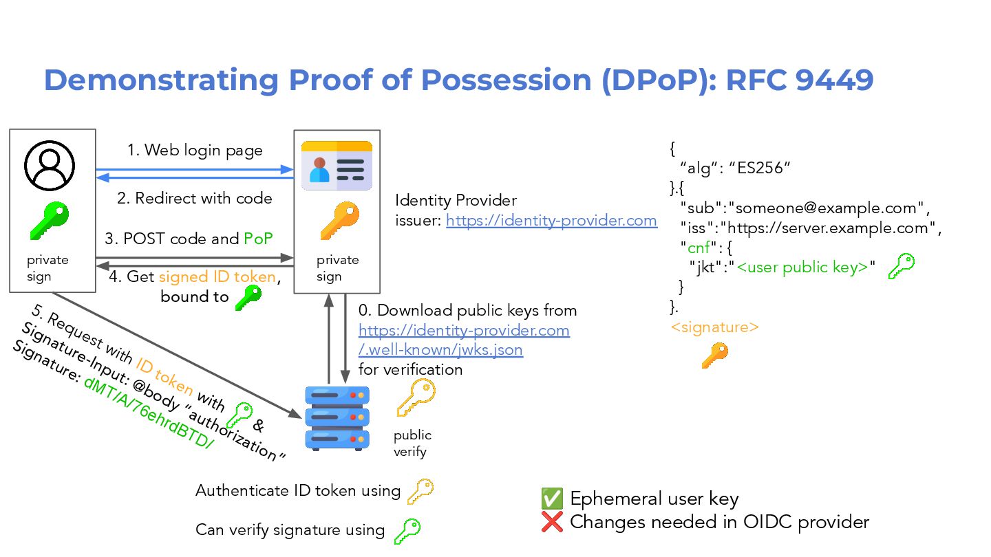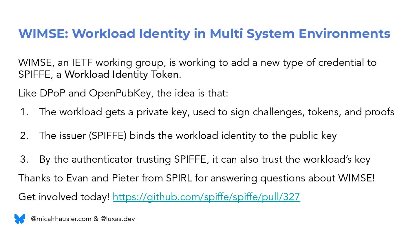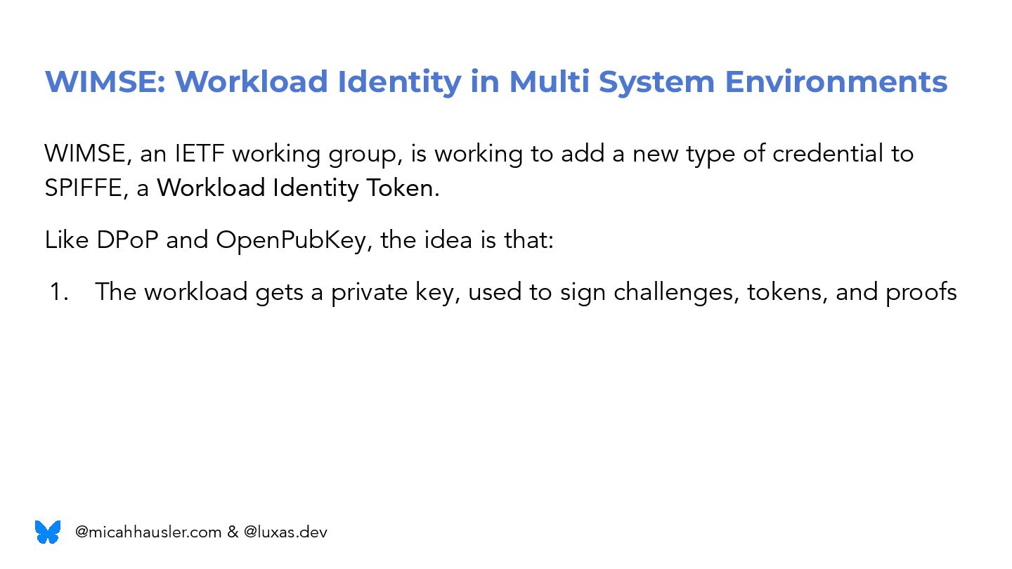 OpenID Connect (OIDC) and mutual TLS are popular authentication mechanisms used widely in cloud native environments, and commonly as a basis for workload identity in SPIFFE. However, OIDC tokens are prone to interception, replay, and forwarding attacks and are unable to guarantee end-to-end request authenticity. Mutual TLS solves those problems at the transport layer, but is rarely used in browsers, and seldom fully end-to-end in microservices-oriented systems. HTTP Message Signatures is a new IETF specification that aims to solve credential replay, forwarding and end-to-end integrity attacks, and be broadly deployable.