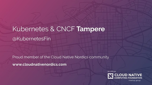 sit down and network with others :wink: 17:15 - 17:30 Updates from the Cloud Native Nordics Community - Lucas Käldström, CNCF Ambassador - Oliver Joggerst, Netum 17:30 - 17:55 Kubernetes as a service in AKS for Real-Time API with NATS and HEMERA - Sergey Sedelnikov, Stora Enso 18:00 - 18:30 Networking, food, drinks 18:30 - 18:55 Reflections from my first KubeCon - communities, operators, and more - Carol Chen, Red Hat 19:00 - 19:25 Serverless: A natural step in DevOps thinking - Cihan Bebek, Futurice 19:30 - 20:00 Networking An official meetup group