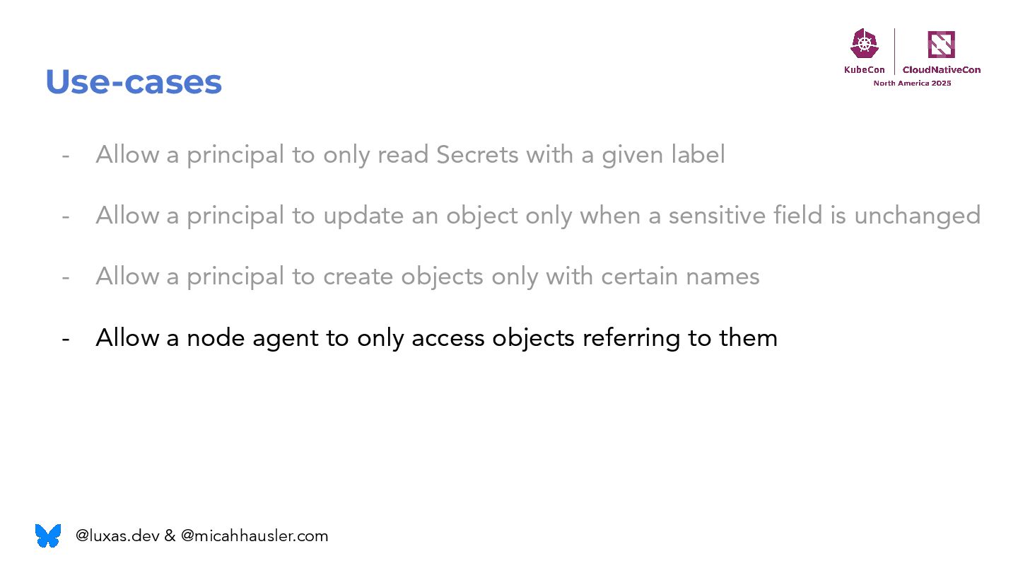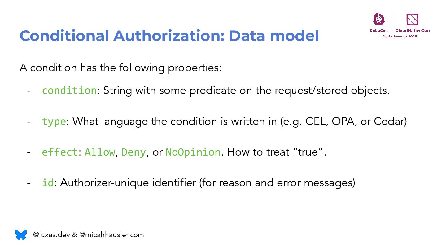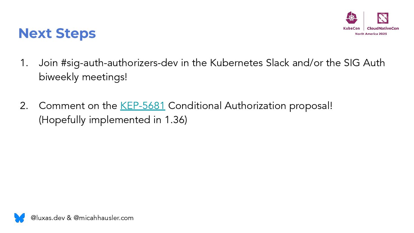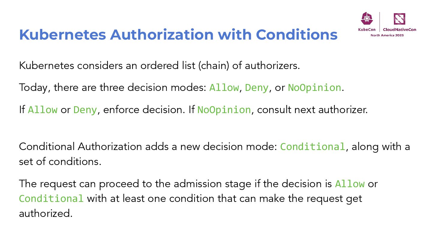 This talk is part of a journey to improve Kubernetes access control in core. However, to make this initiative successful, user feedback is needed throughout the process. You’ll learn about the planned Kubernetes Conditional Authorization feature, which will make authoring right-sized policies easier.