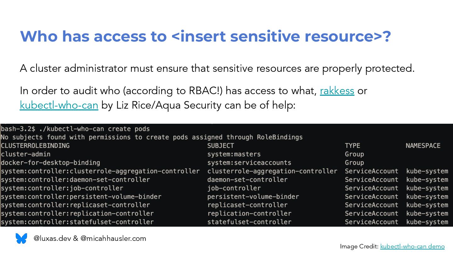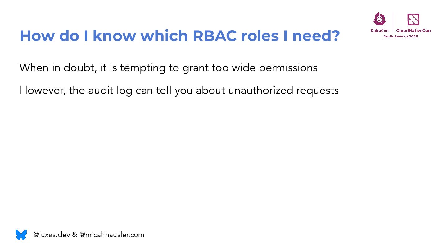 In this talk, Kubernetes contributors Micah and Lucas introduce you to open source tools that help you on your defense in depth journey for securing the Kubernetes API surface. They demonstrate how to right-size your RBAC rules semi-automatically, audit who can access sensitive resources, and check whether policy refactors are correct.