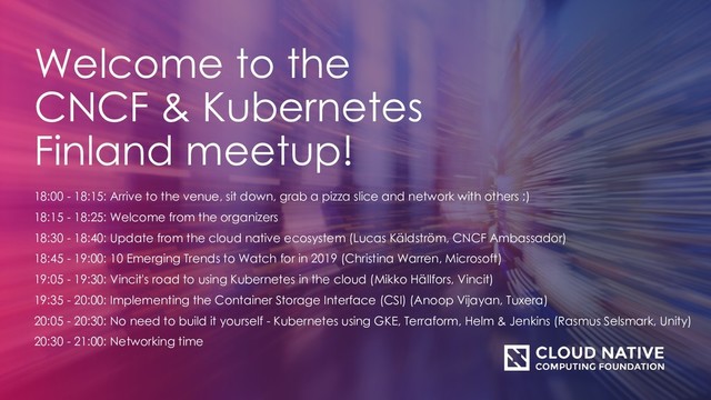 Meetup page: https://www.meetup.com/Kubernetes-Finland/events/255665681/