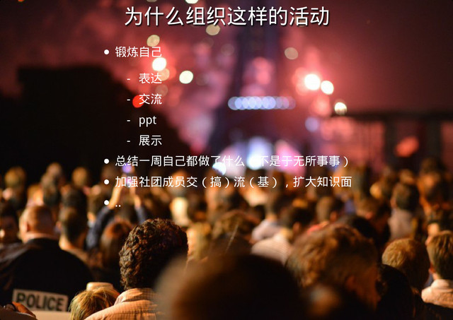 为什么组织这样的活动 锻炼自己 总结一周自己都做了什么(不是于无所事事) 加强社团成员交(搞)流(基),扩大知识面 .. 表达 交流 ppt 展示 -