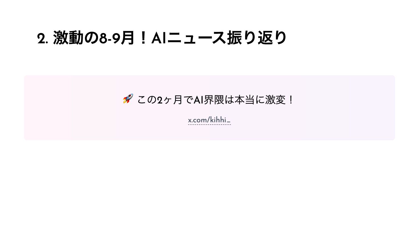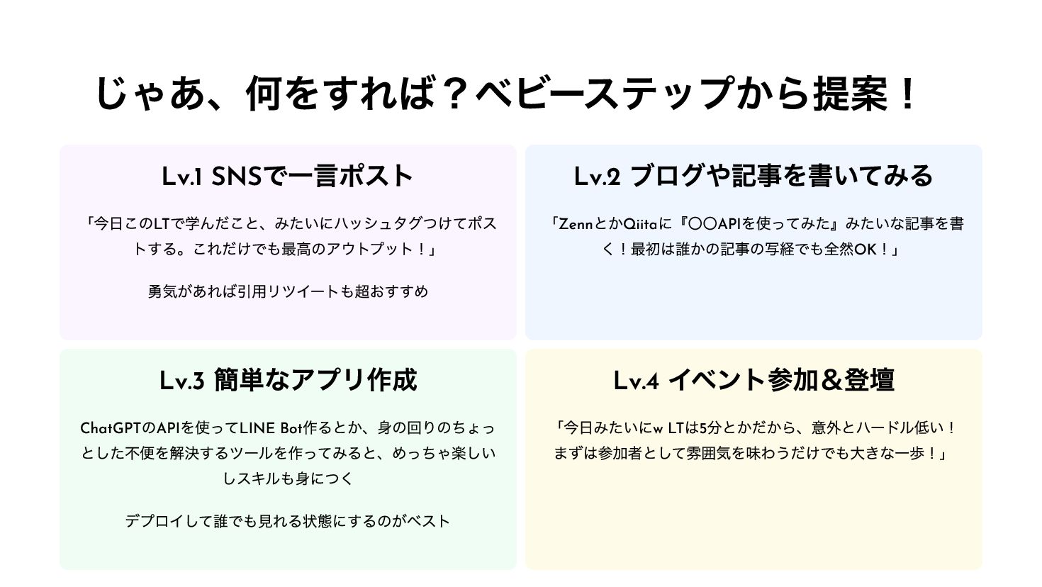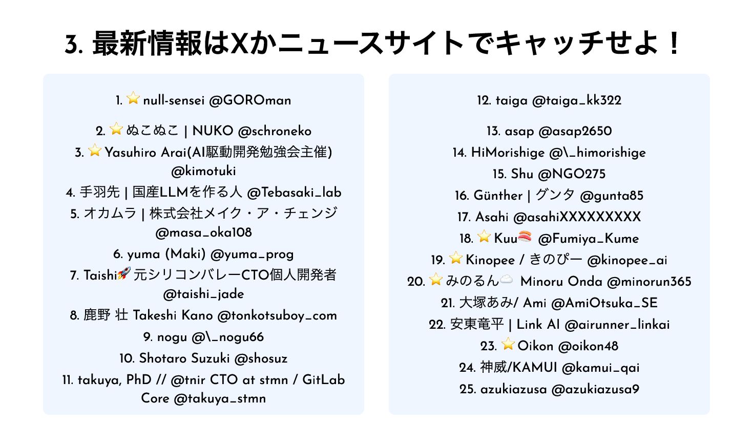 | NUKO @schroneko 3. ⭐️ Yasuhiro Arai(AI 駆動開発勉強会主催 ) @kimotuki 4. 手羽先 | 国産 LLM を作る人 @Tebasaki_lab 5. オカムラ | 株式会社メイク・ア・チェンジ @masa_oka108 6. yuma (Maki) @yuma_prog 7. Taishi 🚀元シリコンバレー CTO 個人開発者 @taishi_jade 8. 鹿野 壮 Takeshi Kano @tonkotsuboy_com 9. nogu @\_nogu66 10. Shotaro Suzuki @shosuz 11. takuya, PhD // @tnir CTO at stmn / GitLab Core @takuya_stmn 12. taiga @taiga_kk322 13. asap @asap2650 14. HiMorishige @\_himorishige 15. Shu @NGO275 16. Günther | グンタ @gunta85 17. Asahi @asahiXXXXXXXXX 18. ⭐️ Kuu 🍣 @Fumiya_Kume 19. ⭐️ Kinopee / きのぴー @kinopee_ai 20. ⭐️みのるん☁️ Minoru Onda @minorun365 21. 大塚あみ / Ami @AmiOtsuka_SE 22. 安東竜平 | Link AI @airunner_linkai 23. ⭐️ Oikon @oikon48 24. 神威 /KAMUI @kamui_qai 25. azukiazusa @azukiazusa9