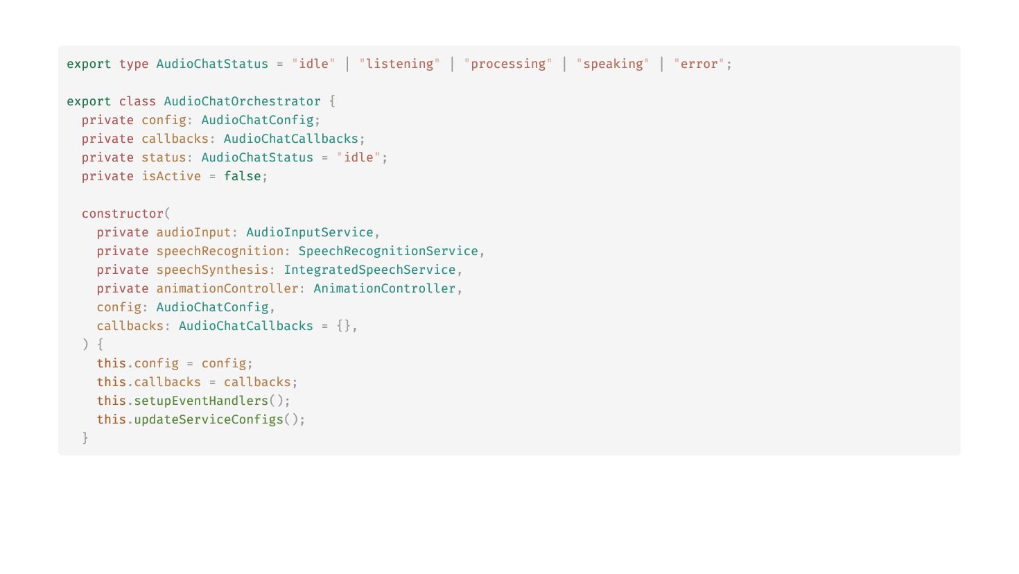 "speaking" | "error"; export class AudioChatOrchestrator { private config: AudioChatConfig; private callbacks: AudioChatCallbacks; private status: AudioChatStatus = "idle"; private isActive = false; constructor( private audioInput: AudioInputService, private speechRecognition: SpeechRecognitionService, private speechSynthesis: IntegratedSpeechService, private animationController: AnimationController, config: AudioChatConfig, callbacks: AudioChatCallbacks = {}, ) { this.config = config; this.callbacks = callbacks; this.setupEventHandlers(); this.updateServiceConfigs(); }