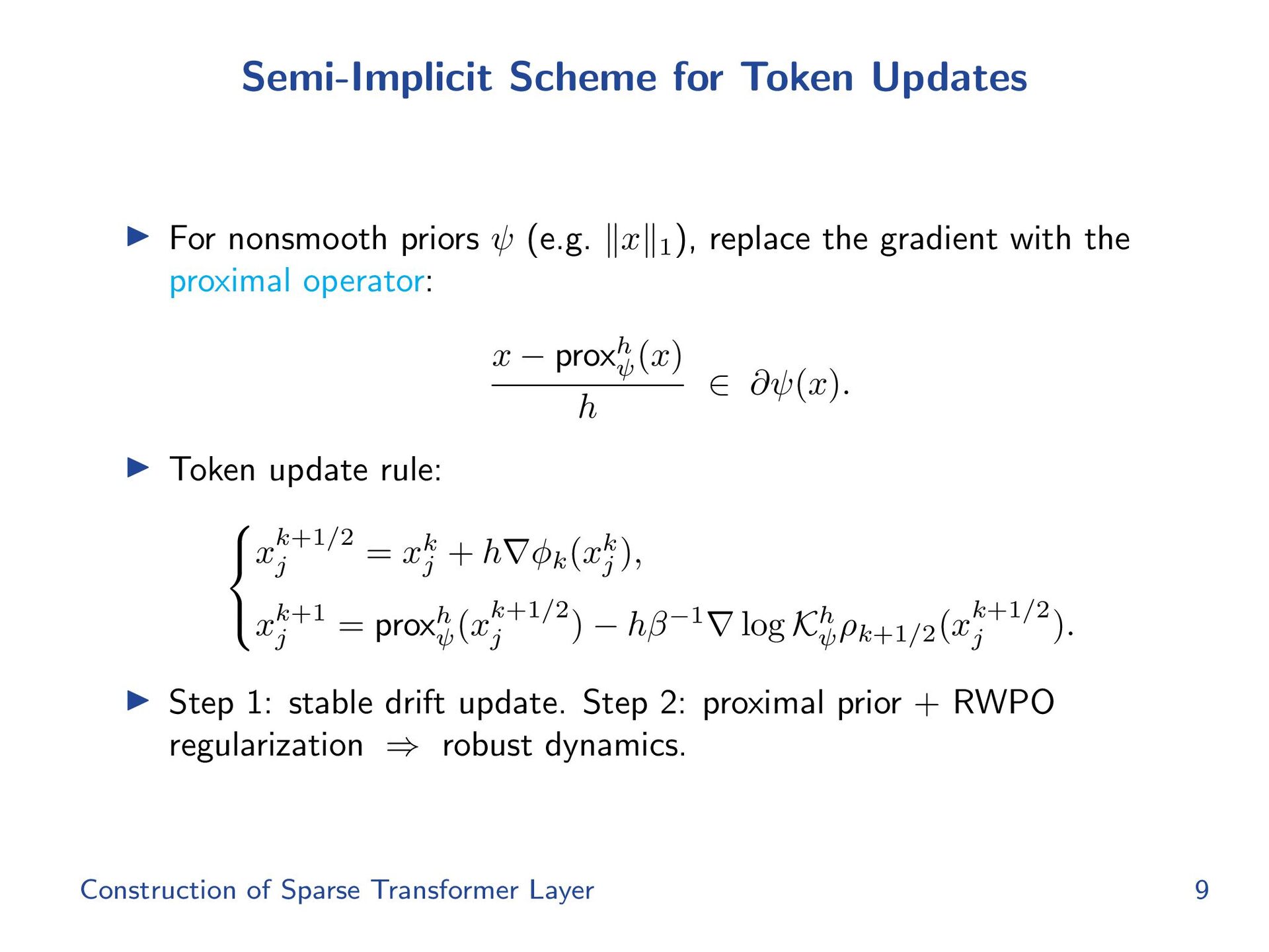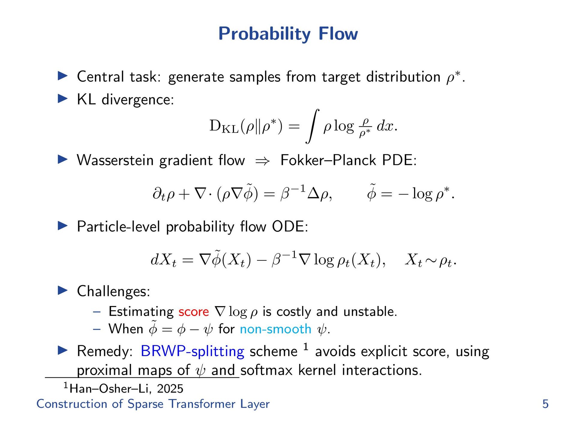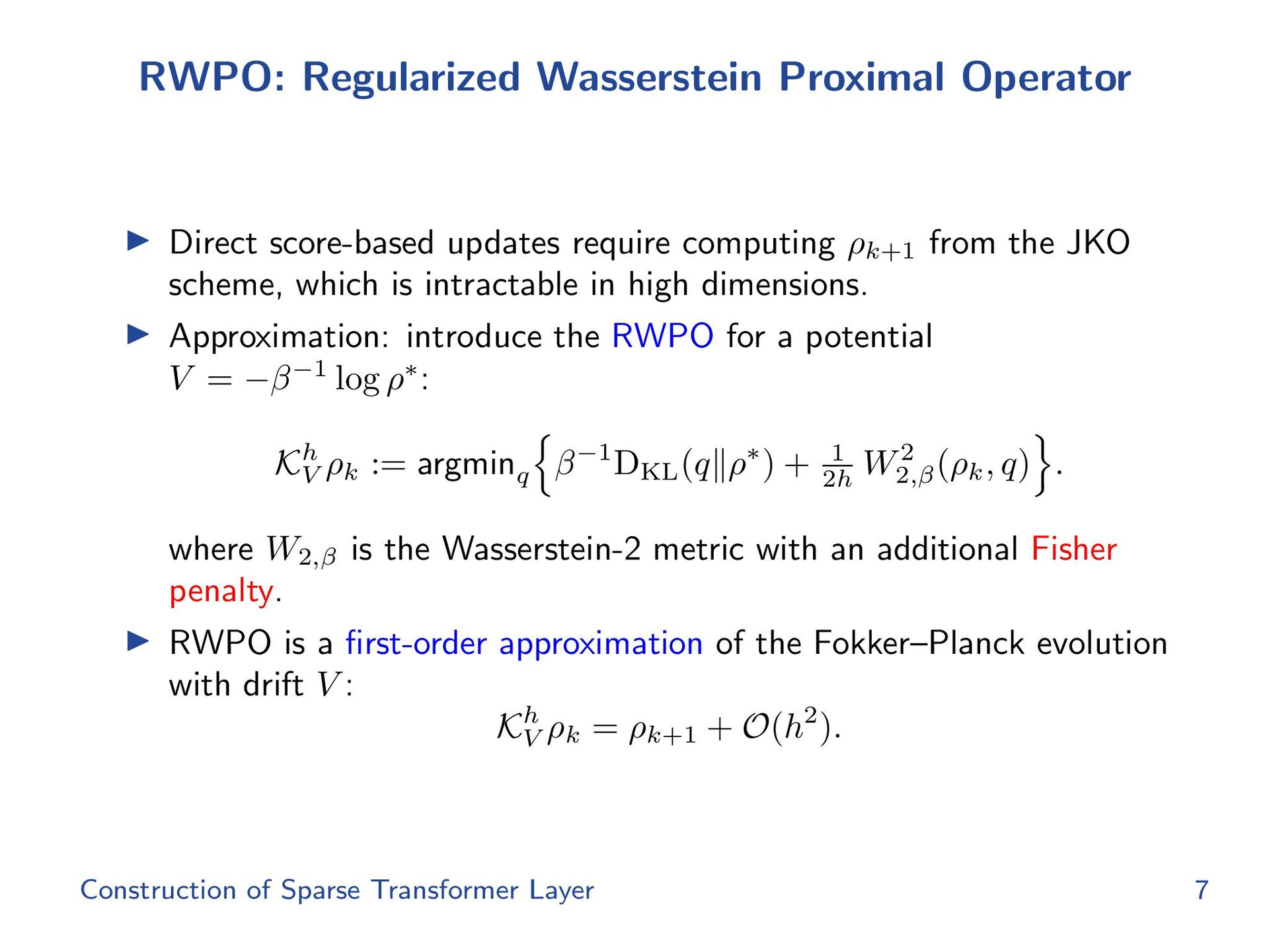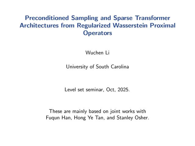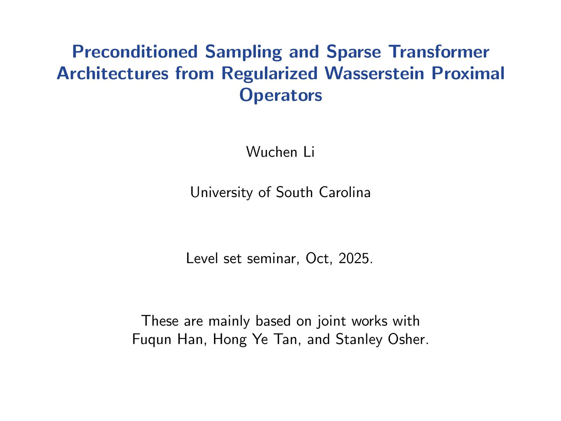 We present a unified framework connecting sampling algorithms, optimal transport, and transformer architectures. The approach introduces a preconditioned, noise-free sampling method based on the regularized Wasserstein proximal operator, derived via a Cole–Hopf transformation on anisotropic heat equations. Extending this connection, we design a sparse transformer architecture that embeds an L₁ prior to enhance convexity and promote sparsity of the learning problem. Theoretical results show non-asymptotic convergence with explicit bias characterization, and experiments demonstrate improved efficiency and accuracy across Bayesian neural networks, Bayesian inverse problems, and generative modeling of image distributions.