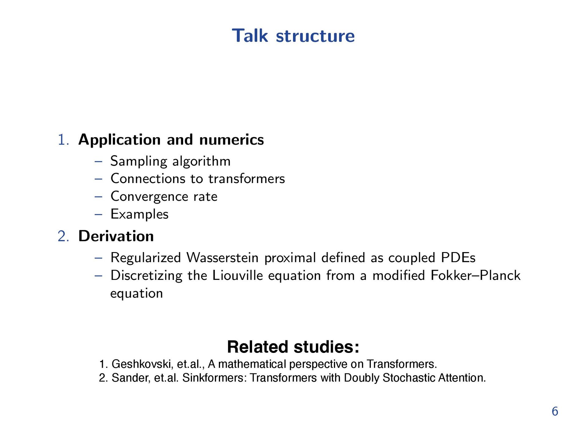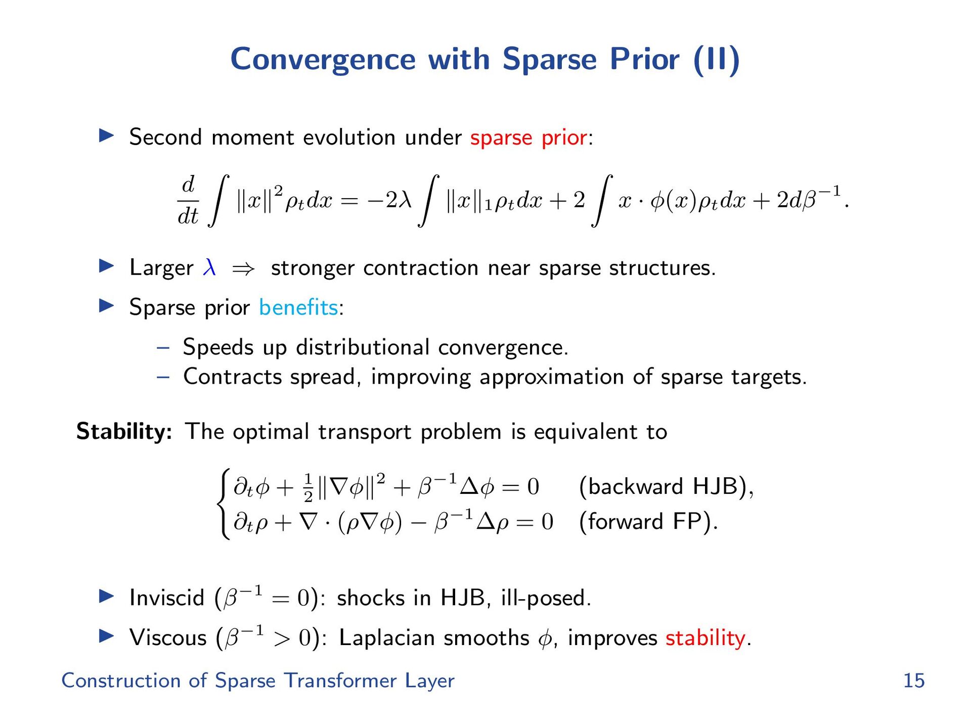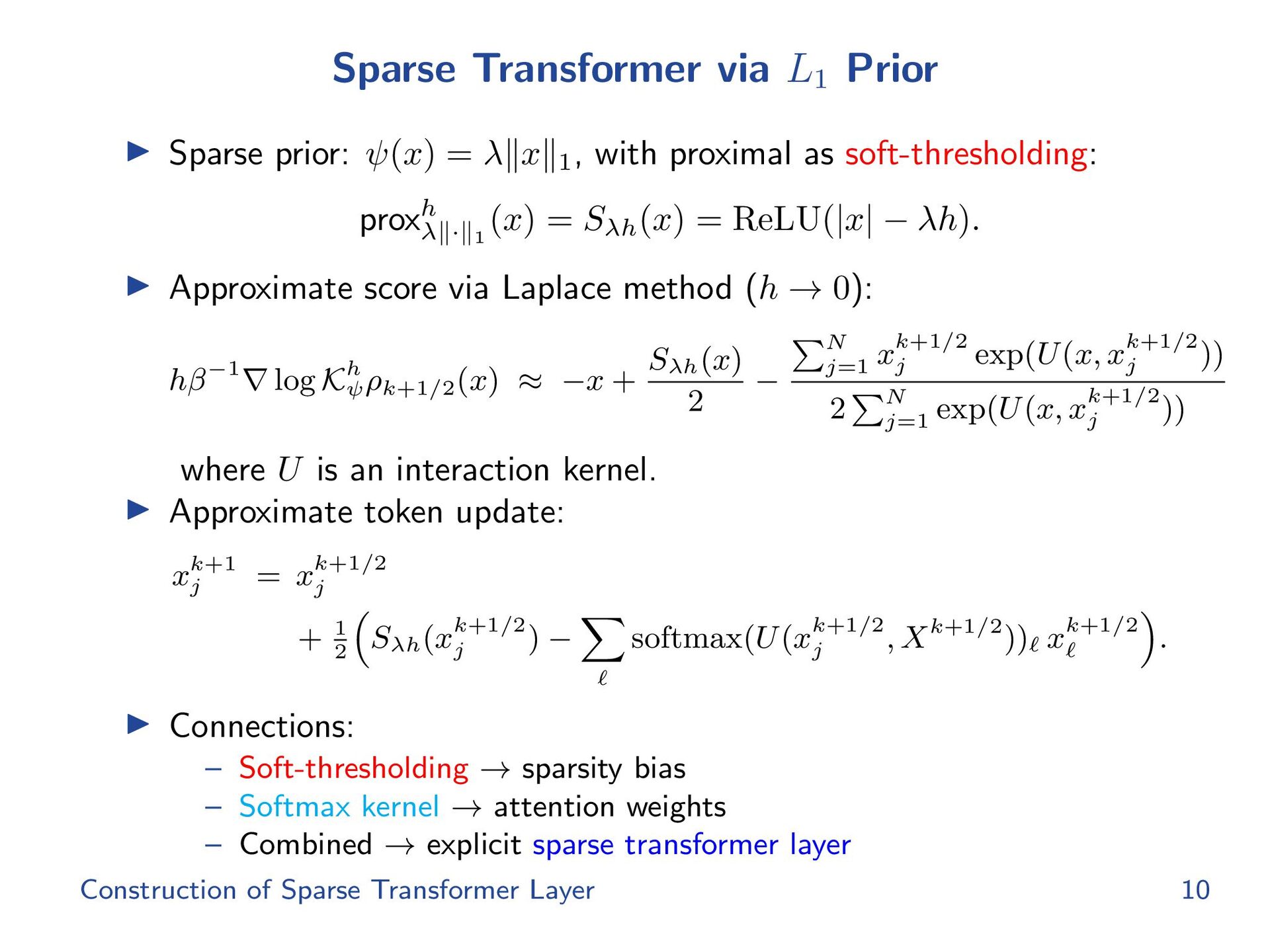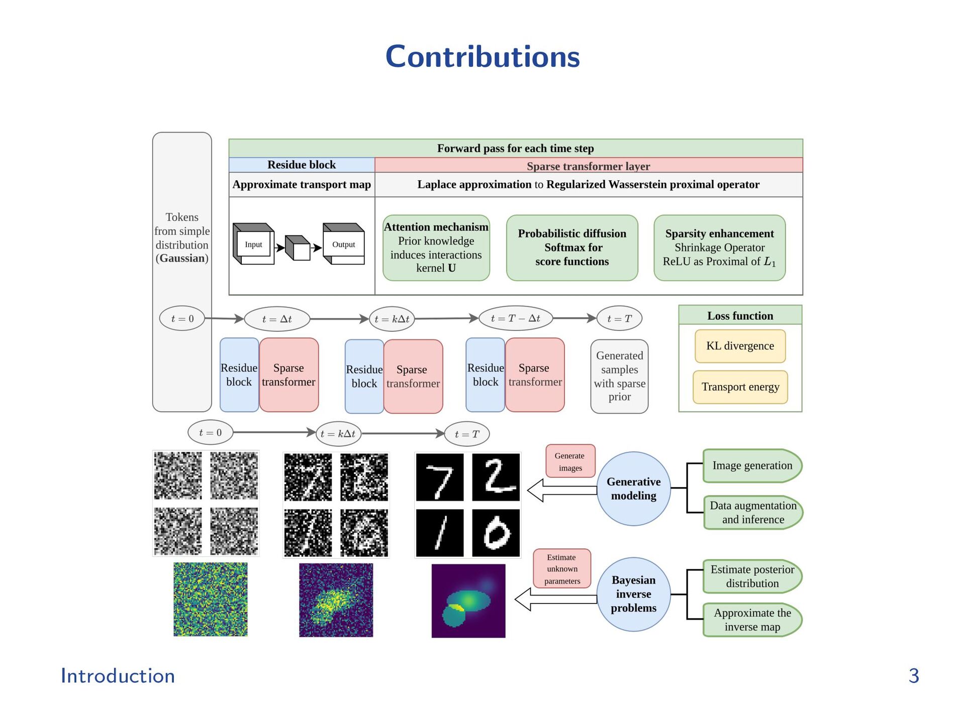 We present a unified framework connecting sampling algorithms, optimal transport, and transformer architectures. The approach introduces a preconditioned, noise-free sampling method based on the regularized Wasserstein proximal operator, derived via a Cole–Hopf transformation on anisotropic heat equations. Extending this connection, we design a sparse transformer architecture that embeds an L₁ prior to enhance convexity and promote sparsity of the learning problem. Theoretical results show non-asymptotic convergence with explicit bias characterization, and experiments demonstrate improved efficiency and accuracy across Bayesian neural networks, Bayesian inverse problems, and generative modeling of image distributions.