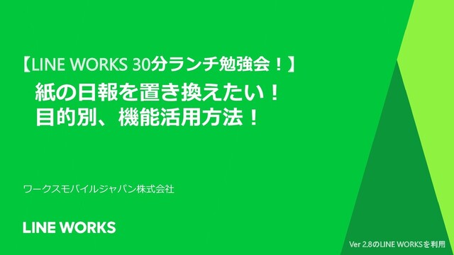 積して管理したい場合。 全社で日報を蓄積して管理 したい場合。 日報のデータを出力して集 計や加工したい場合。 現場作業などカレンダーの 予定ごとに管理したい場合。 利用方法例 業務日報テンプレートを利 用して投稿。 カテゴリーに日報を作成し て、業務日報テンプレート で投稿。 日報用掲示板を作成して、 業務日報テンプレートで投 稿。 業務日報テンプレートを利 用して、アンケートを作成。 各予定のメモ欄に記載。 注意点 トークが多いと見失いがち になる。 投稿が増えた場合の運用方 法の検討が必要。 掲示板毎に閲覧制限をした い場合は管理が煩雑になる 恐れあり。 アンケートの事前準備が手 間になる。 管理するメンバーが増える と、確認する側は大変にな る。 運用の容易さ 〇 〇 △ △ 〇 テンプレート あり カスタマイズ可 あり カスタマイズ可 あり カスタマイズ可 あり カスタマイズ可 無し 情報の蓄積 × 〇 〇 〇 〇 CSVファイル出 力 × × × 〇 × チームメンバー への共有 〇 〇 〇 〇 〇 既読確認 トークルームの メンバー全員 投稿者もしくは グループマスター 投稿者もしくは 掲示板の管理者 作成者による 回答者の確認のみ 無し 再通知 × × 〇(未読メンバーへ) 〇(未回答者へ) × 日報への コメント 〇 〇 〇 × ×