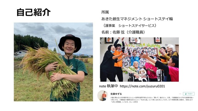 所属 あきた創生マネジメント ショートステイ輪 (護事業 ショートステイサービス) 名前:佐藤 弦(介護職員) 自己紹介 note 執筆中