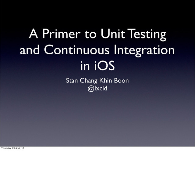 The talk began with my thoughts about testing. Then, I start describing the various techniques of testing from unit to user acceptance, specification-based to scenario-based, mocking object to matcher. After which I introduces command line tools of Xcode and how you can manage your tests with Makefile or Rakefile. Finally, with that you can set up a Continuous Integration Server to execute the tests at specific interval or on every commit. All these contents created with a focus on iOS. As I only had less than an hour of speaking time, my contents only touches the surface. Nevertheless, I hope you enjoy the slides.