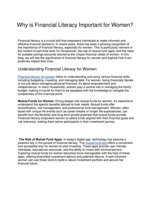solid foundation of savings is equally important. Financial literacy extends to choosing the right savings account for women and recognizing the features that suit their requirements. Savings accounts designed for women may offer perks such as lower fees, higher interest rates, or special discounts on financial products and services. Understanding the nuances of these accounts ensures that women can optimize their savings, creating a financial safety net for themselves and their families. Part-Time Work for Housewives: One avenue through which women can enhance their financial well-being is by engaging in part-time work. Many housewives find themselves with valuable skills and time that can be utilized to generate income. From part time work for housewife to navigating mutual fund apps and selecting suitable savings accounts, financial literacy is the key to unlocking a world of opportunities. Understanding the financial implications of such endeavors is vital for making informed decisions and maximizing the benefits of part-time work. Savings Account for Housewives: For housewives, managing finances often involves a different set of considerations. A savings account tailored for housewives may offer flexibility in terms of withdrawal limits, joint account options with spouses, and features that cater to irregular income streams. Financial literacy empowers housewives to make informed choices about the most suitable savings accounts for their unique circumstances, contributing to the overall financial well-being of the household. Empowering Women Through Financial Literacy: Beyond the practical aspects of managing money, financial literacy has broader implications for women's empowerment. It fosters confidence, independence, and the ability to overcome financial challenges. When women are financially literate, they are better equipped to make decisions that align with their goals, whether investing for the future, starting a business, or navigating unexpected financial setbacks. Conclusion: In conclusion, the importance of financial literacy for women cannot be overstated. Financial literacy provides them with the tools to explore part-time work opportunities, whether it be freelancing, consulting, or starting a small business. By becoming financially literate, women not only enhance their ability to manage money effectively but also pave the way for a more empowered and secure future. As we strive for gender equality, promoting financial literacy among women is a critical step toward achieving economic empowerment and breaking down barriers to financial success.