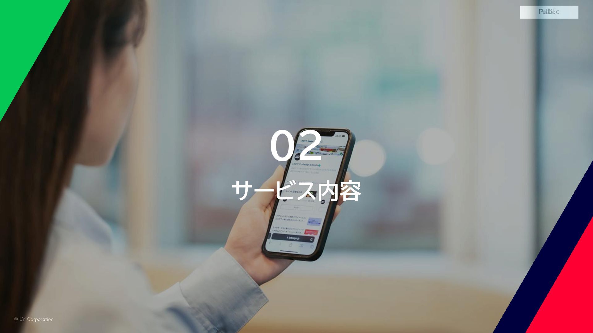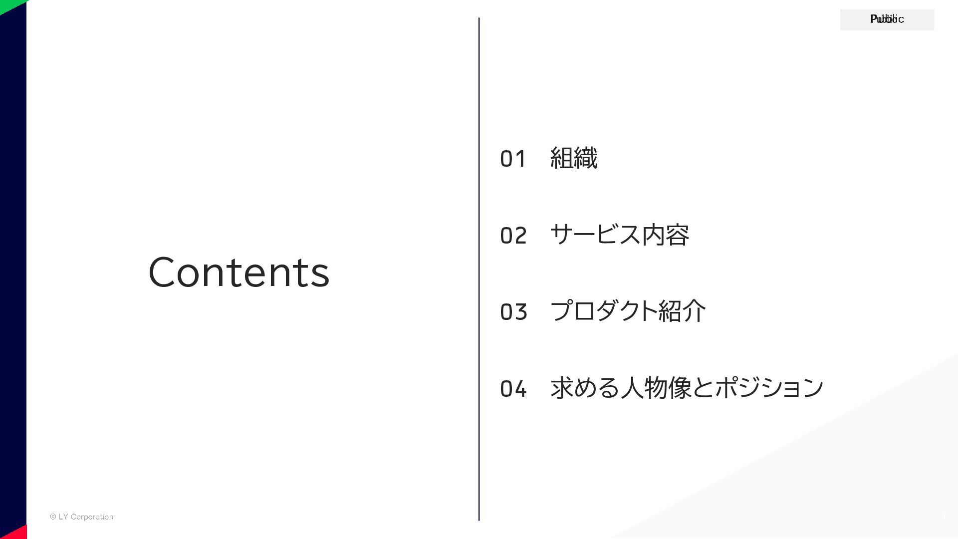 Public © LY Corporation 1 01 組織 02 サービス内容 03