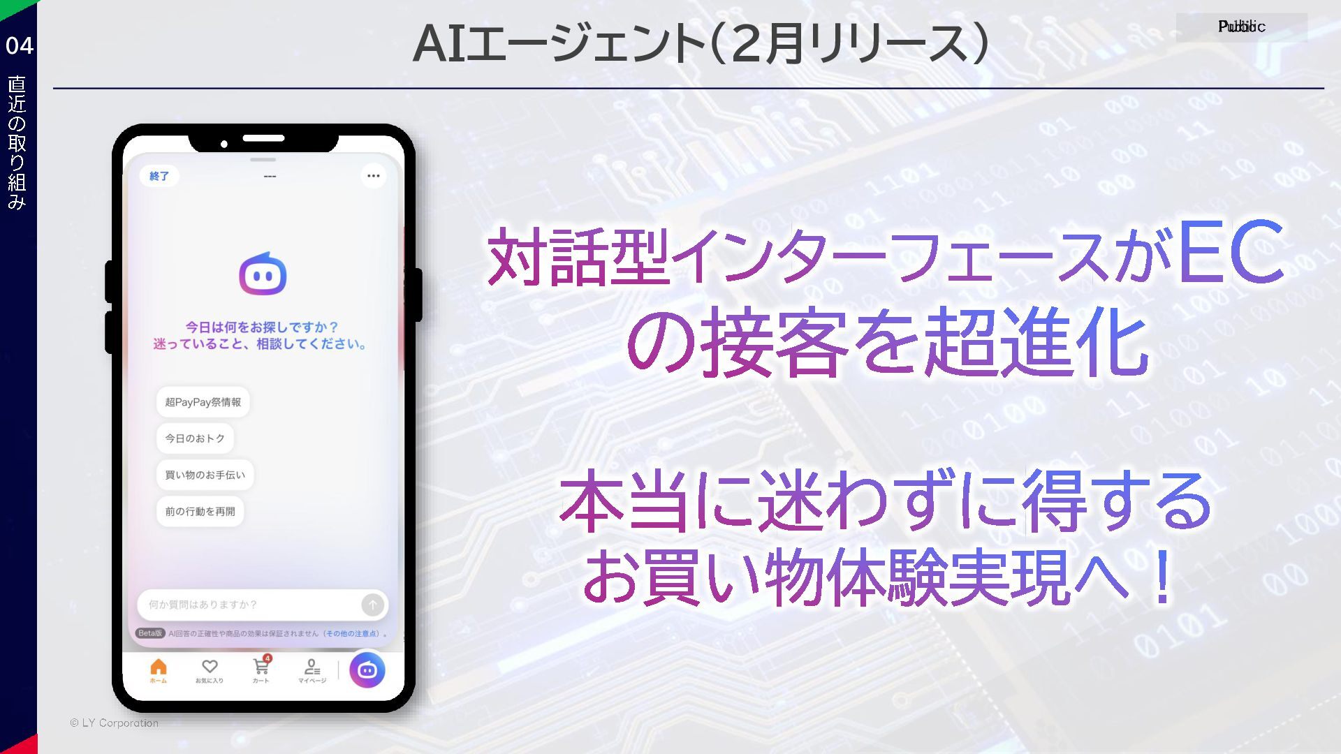 Public © LY Corporation 04 AIエージェント(2月リリース) 対話型インターフェースがEC の接客を超進化 本当に迷わずに得する お買い物体験実現へ!