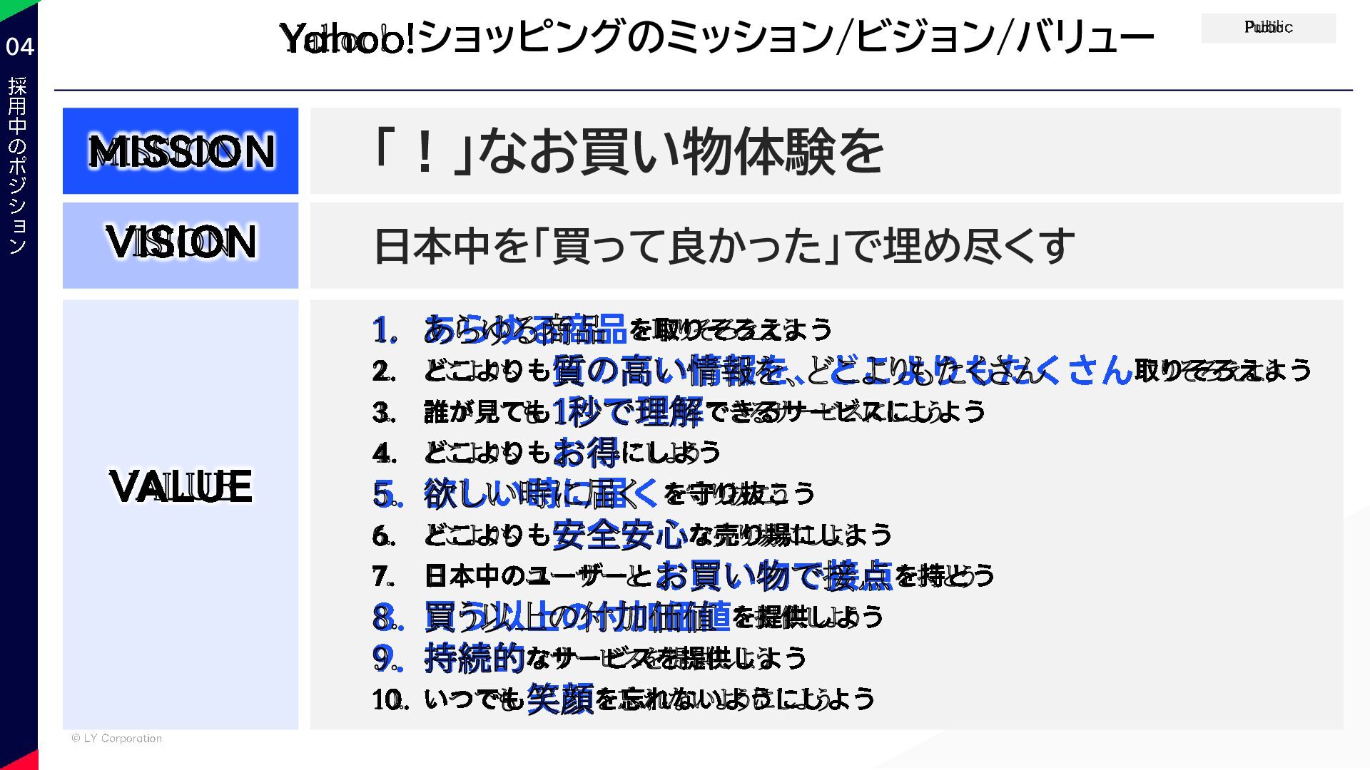 Public © LY Corporation 04 Yahoo! ショッピングのミッション/ビジョン/バリュー 1. あらゆる商品 を取りそろえよう