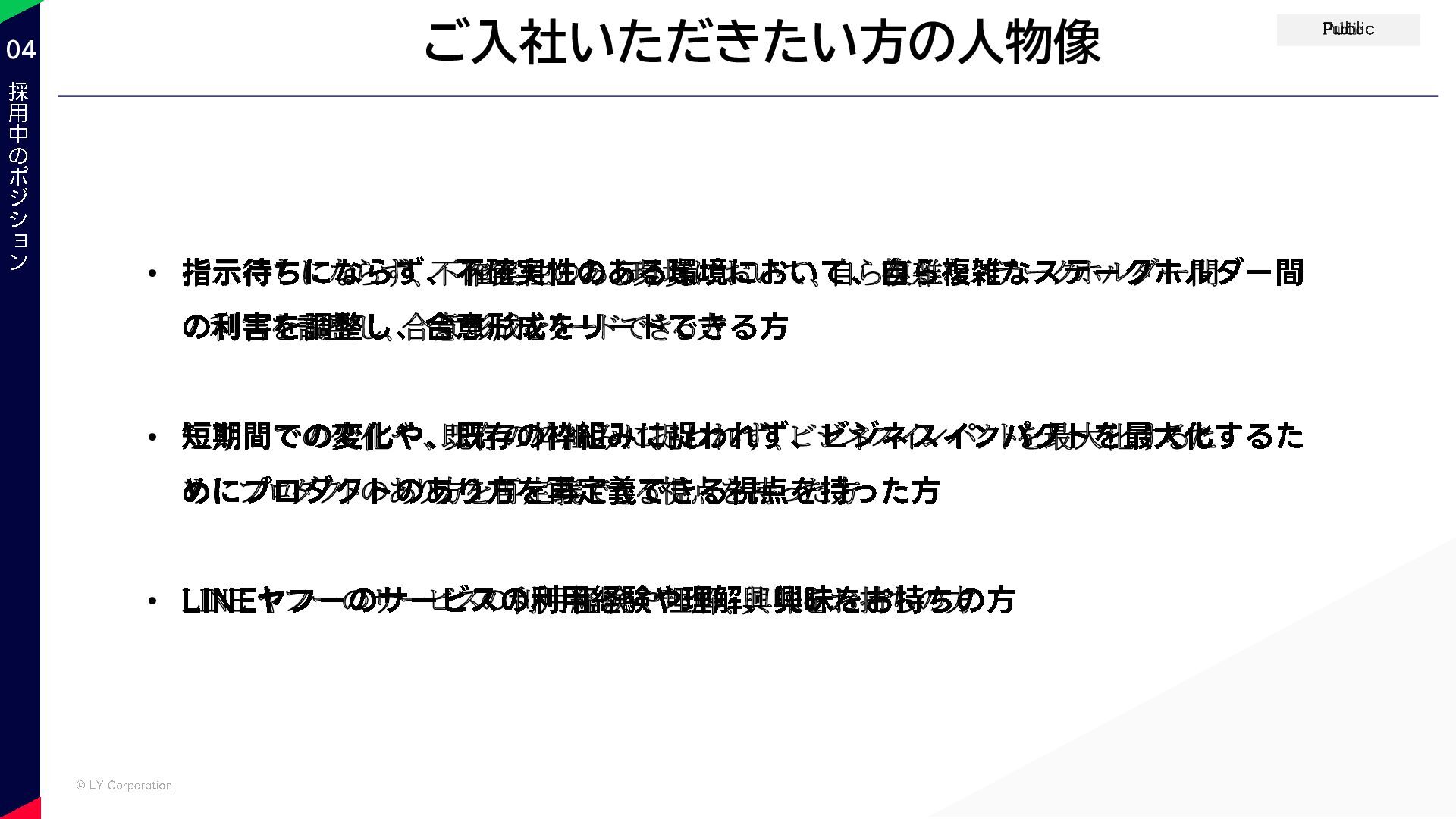 Public © LY Corporation 04 ご入社いただきたい方の人物像 • 指示待ちにならず、不確実性のある環境において、自ら複雑なステークホルダー間 の利害を調整し、合意形成をリードできる方 •