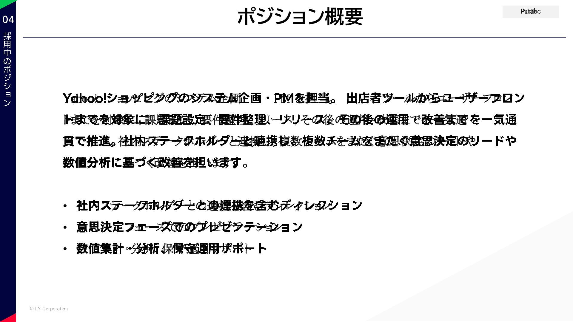 Public © LY Corporation 04 ポジション概要 Yahoo! ショッピングのシステム企画・ PM を担当。