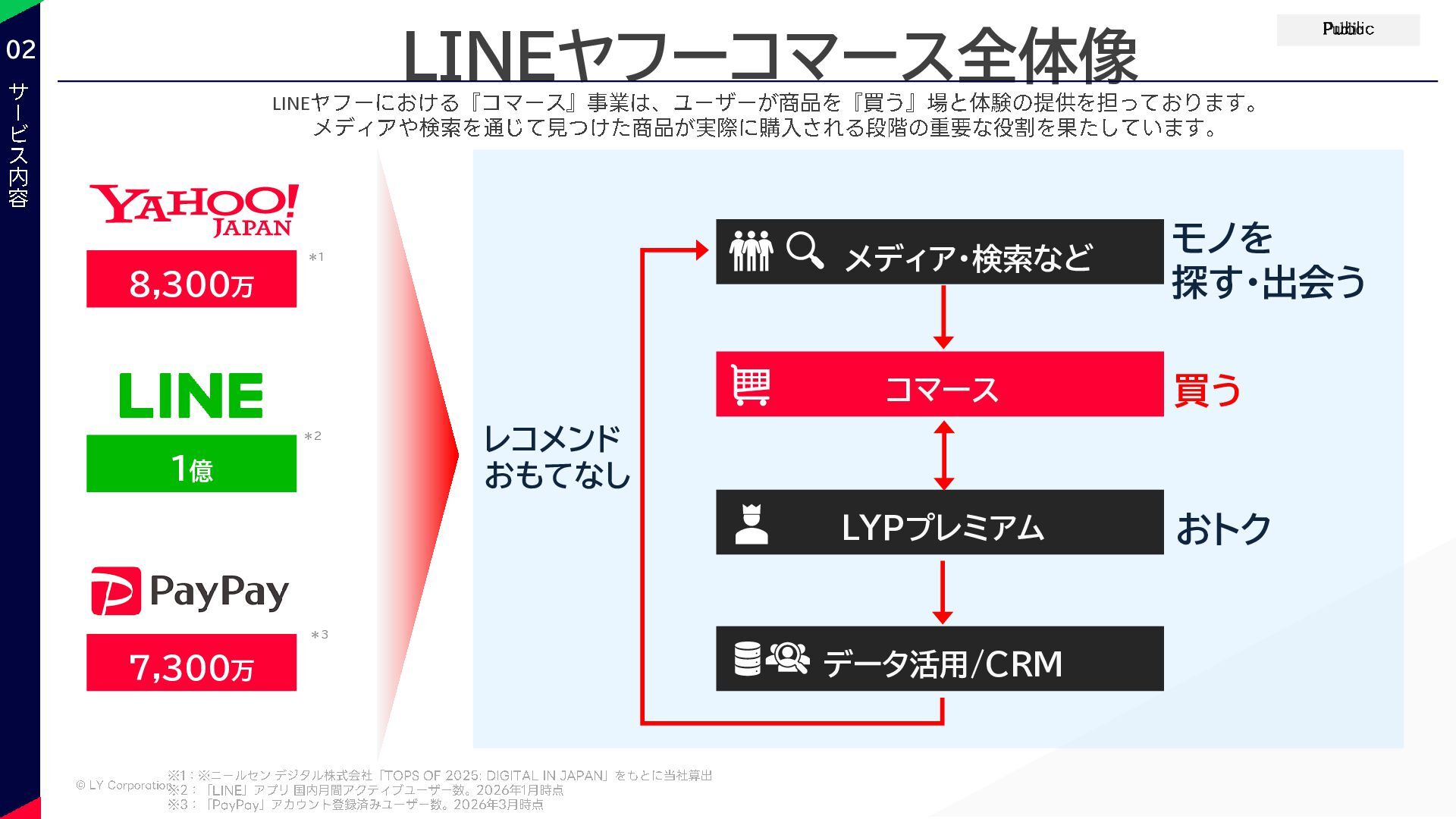 モノを 探す・出会う *1 *2 *3 LINEヤフーにおける 『 コマース 』 事業は、ユーザーが商品を 『 買う 』 場と体験の提供 を担っております。 メディアや検索を通じて見つけた商品が実際に購入される段階の重要な役割を果たしています。 02 サービス内容 8,300万 1億 7,300万 データ活用/CRM コマース メディア・検索など ※1: ※ニールセン デジタル株式会社「 TOPS OF 2025: DIGITAL IN JAPAN 」をもとに当社算出 ※2 :「 LINE 」アプリ 国内月間アクティブユーザー数。 2026 年1月時点 ※3 :「 PayPay 」アカウント登録済みユーザー数。 2026 年3 月時点