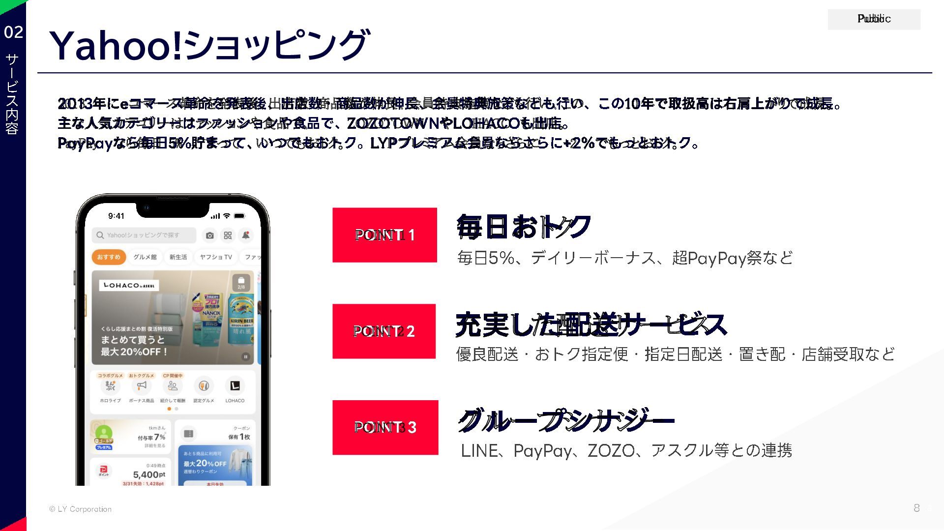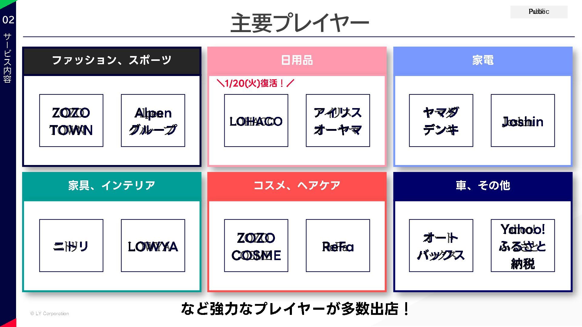 Public © LY Corporation 主要プレイヤー 02 サービス内容 ファッション、スポーツ 日用品 家電