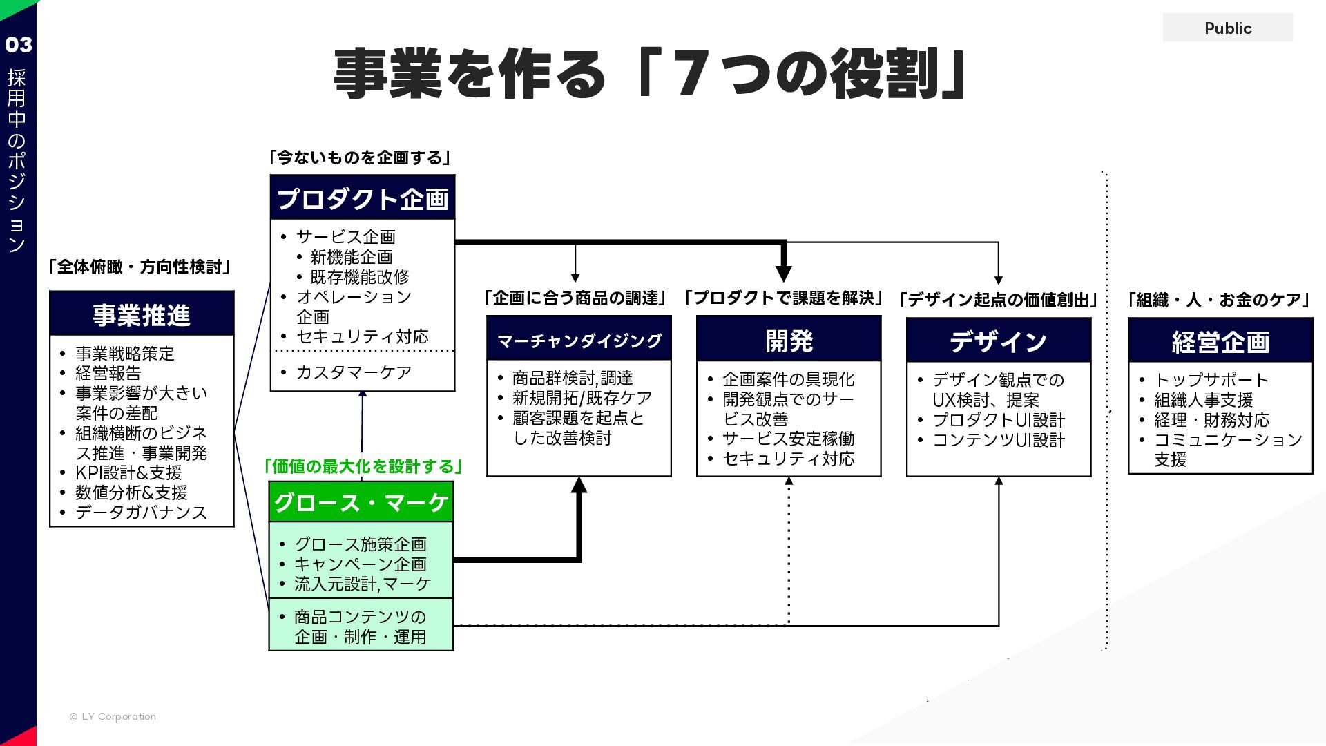 Public © LY Corporation 03 事業を作る「7つの役割」 「今ないものを企画する」 「全体俯瞰・方向性検討」 デザイン •