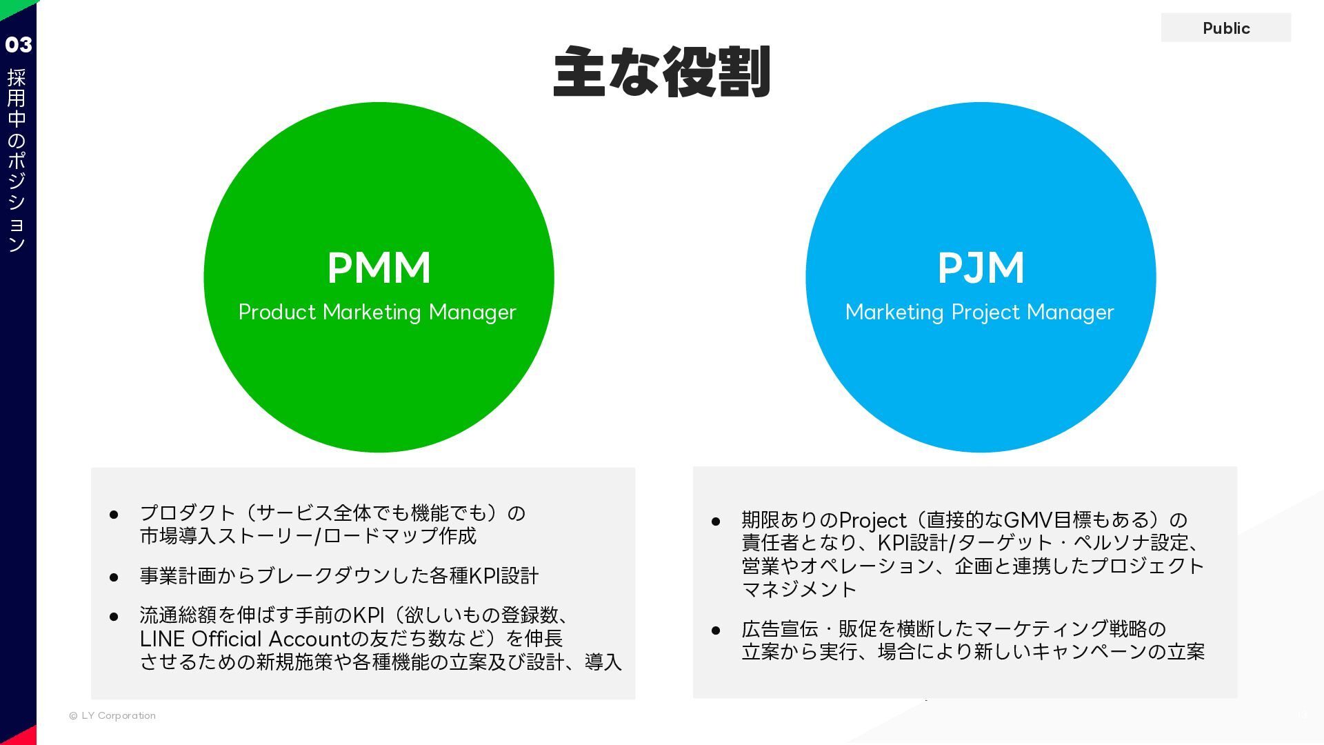 Public © LY Corporation 13 03 主な役割 PMM Product Marketing