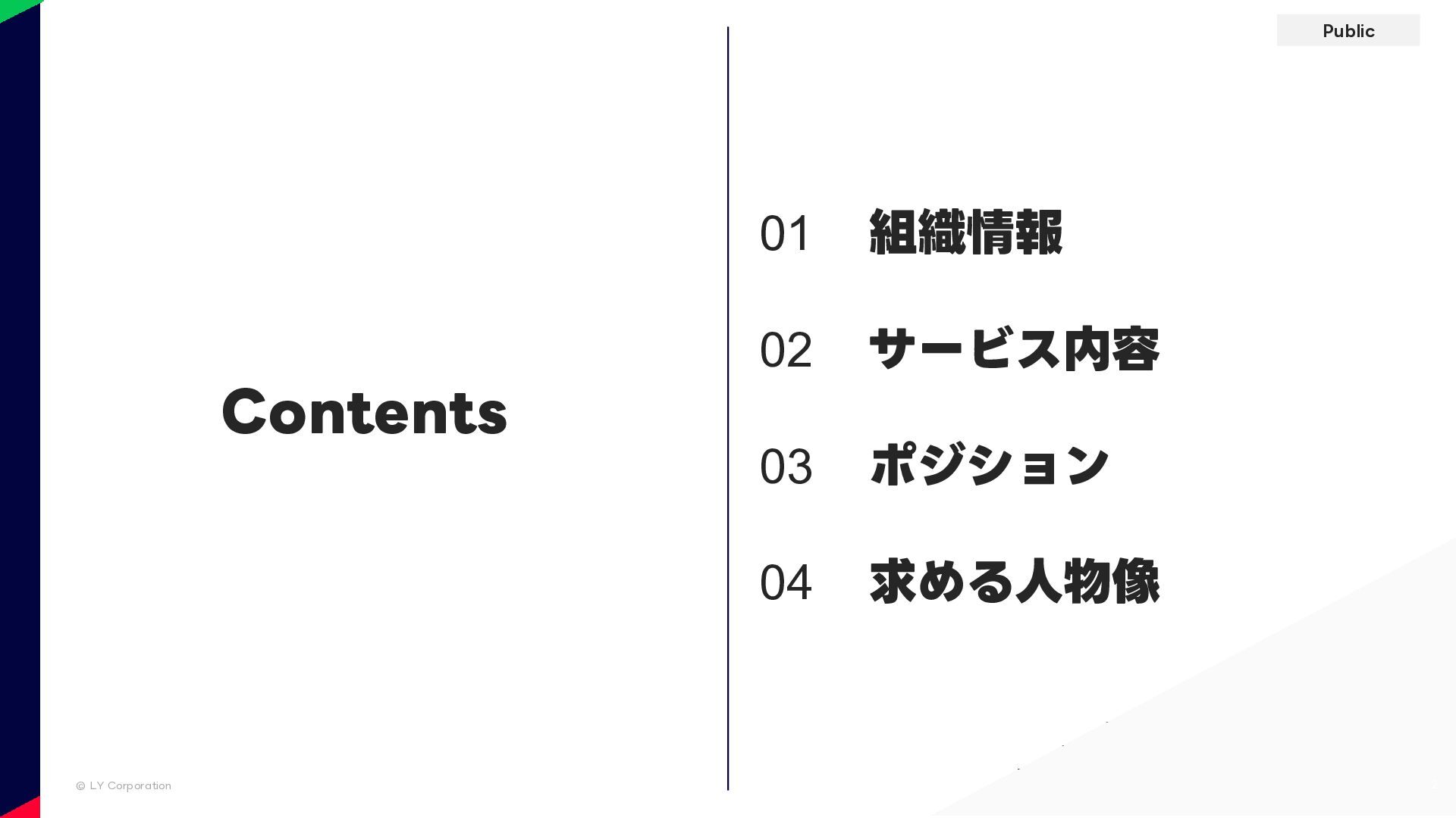 Public © LY Corporation 2 01 組織情報 02 サービス内容 03