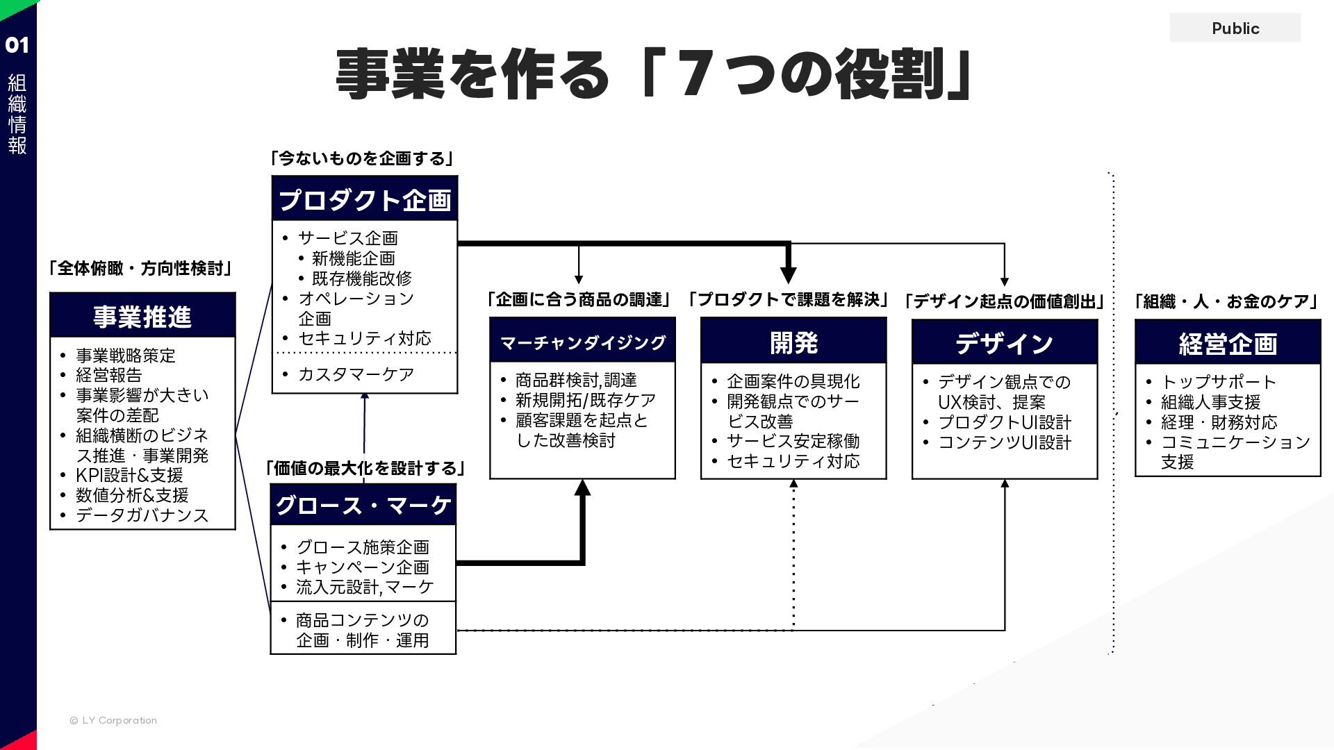 Public © LY Corporation 01 事業を作る「7つの役割」 「今ないものを企画する」 「全体俯瞰・方向性検討」 デザイン •