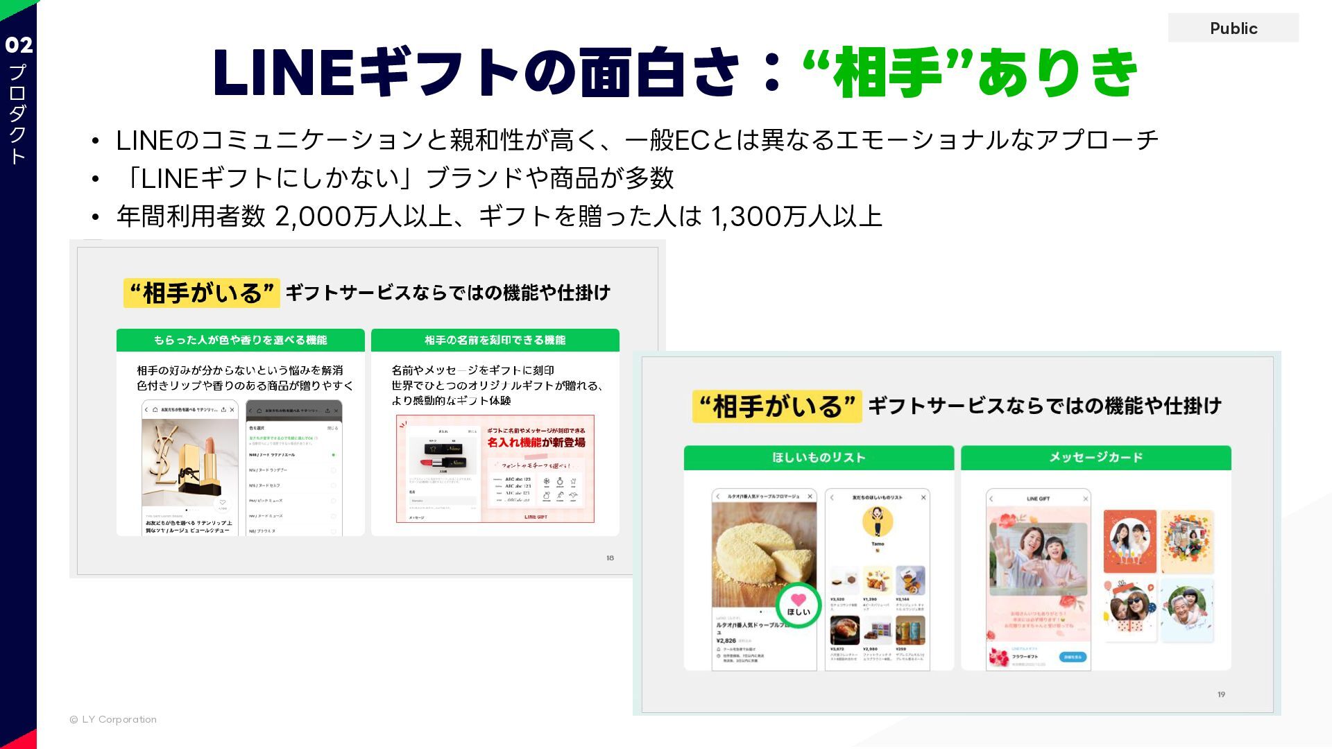 Public © LY Corporation LINEギフトの面白さ:“相手”ありき 02 • LINEのコミュニケーションと親和性が高く、一般ECとは異なるエモーショナルなアプローチ • 「LINEギフトにしかない」ブランドや商品が多数