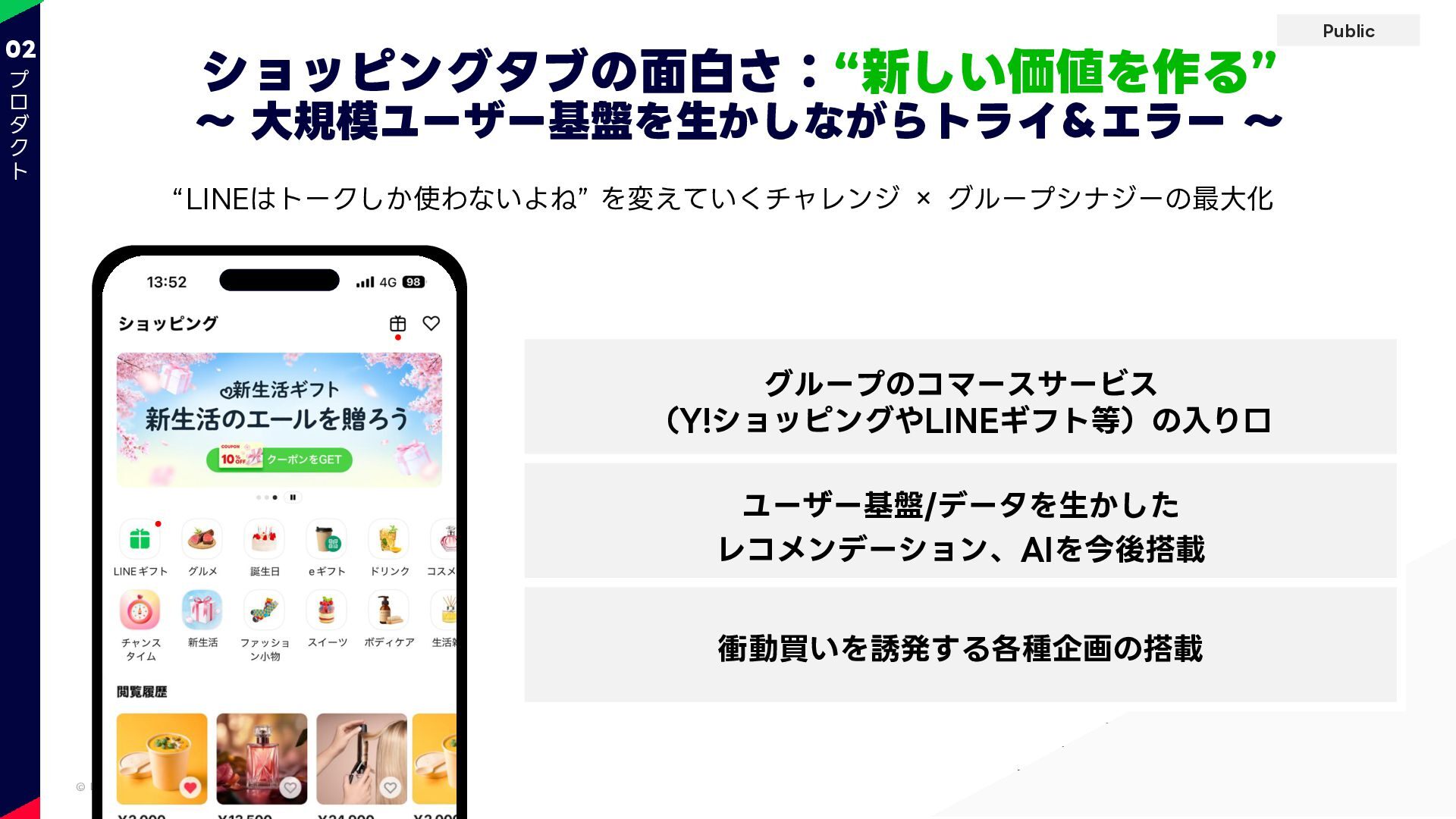 Public © LY Corporation ショッピングタブの面白さ:“新しい価値を作る” ~ 大規模ユーザー基盤を生かしながらトライ&エラー ~ 02 グループのコマースサービス