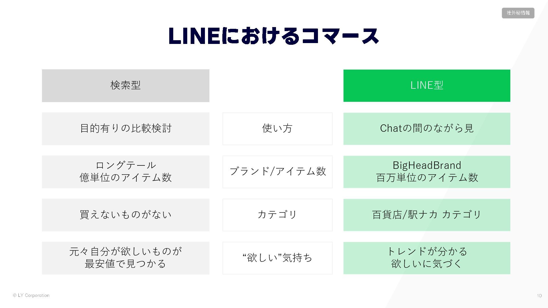 検索型 LINE型 目的有りの比較検討 Chatの間のながら見 ロングテール 億単位のアイテム数 BigHeadBrand 百万単位のアイテム数 買えないものがない 百貨店/駅ナカ