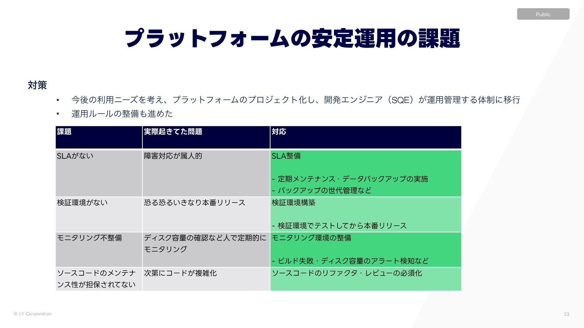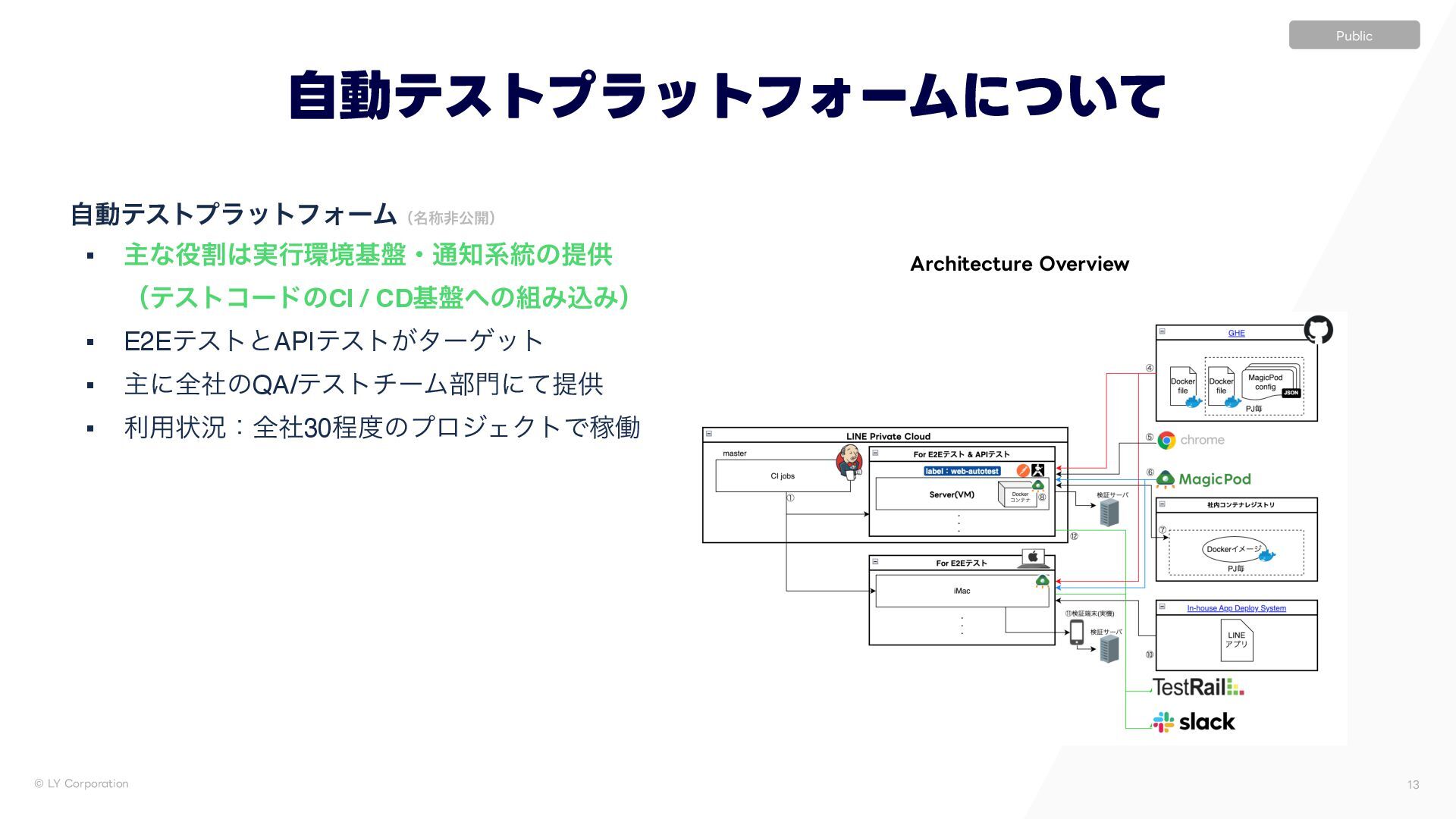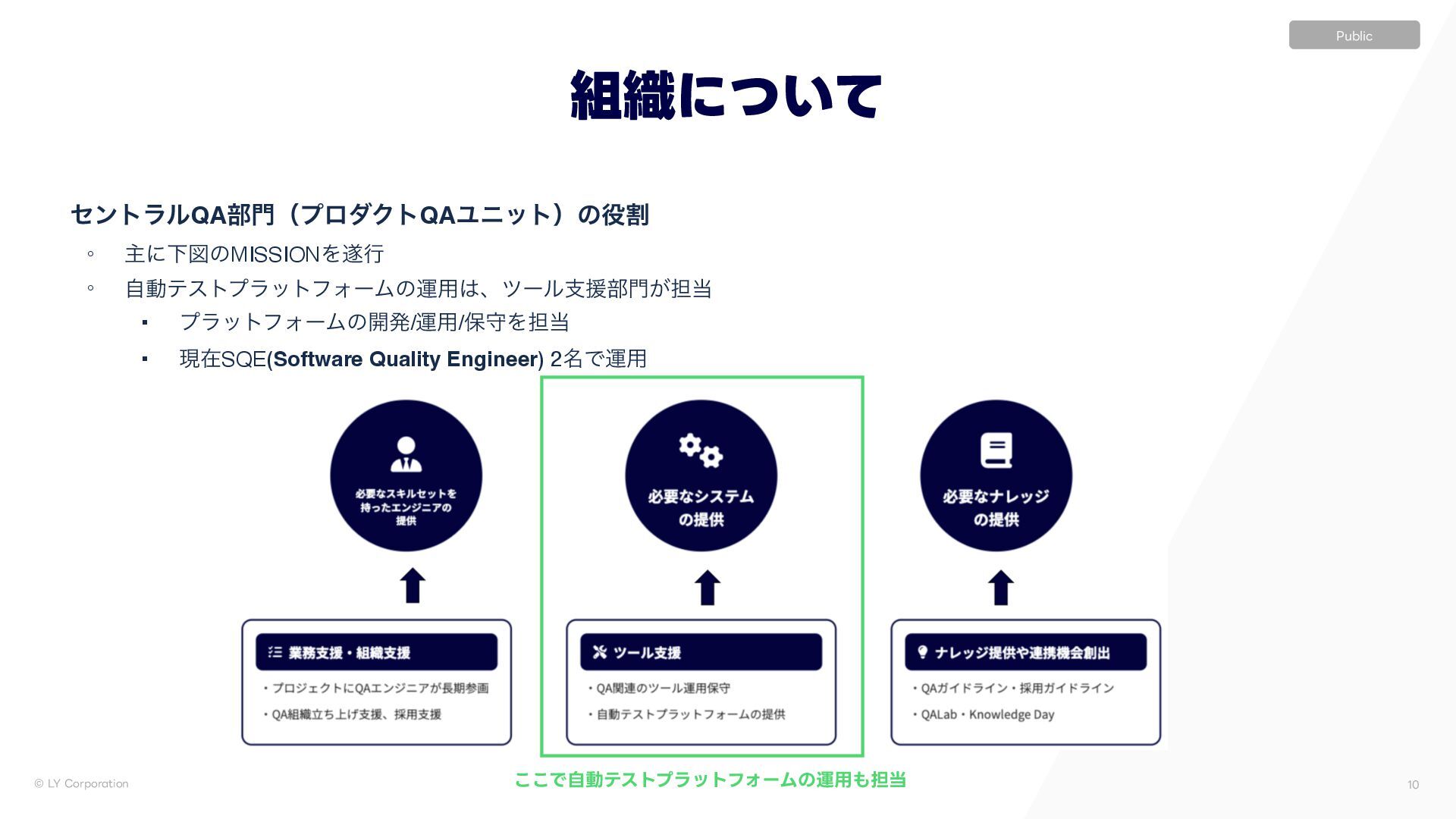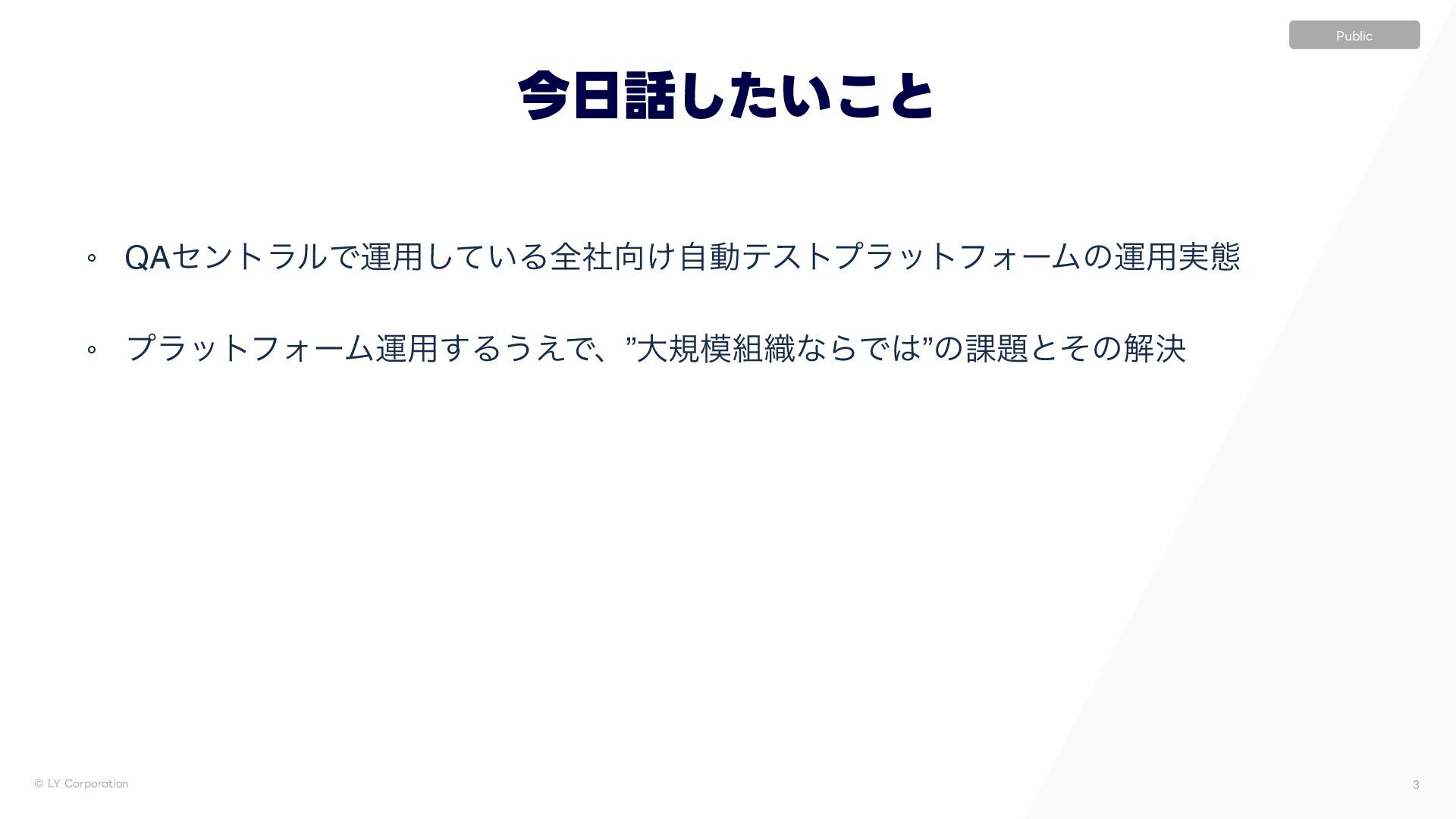 *OUFSOBM6TF0OMZ -:$PSQPSBUJPO 1VCMJD ࠓ͍ͨ͜͠ͱ ◦ QAηϯτϥϧͰӡ༻͍ͯ͠Δશ͚ࣾࣗಈςετϓϥοτϑΥʔϜͷӡ༻࣮ଶ ◦ ϓϥοτϑΥʔϜӡ༻͢Δ͏͑Ͱɺ”େن৫ͳΒͰ”ͷ՝ͱͦͷղܾ