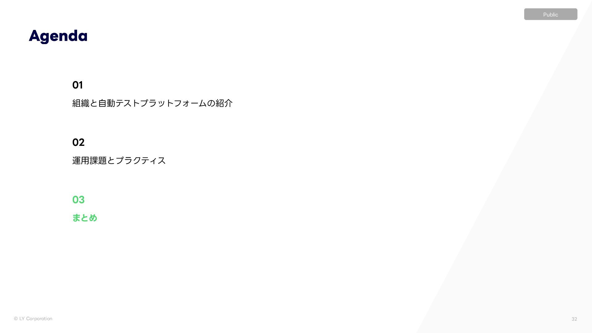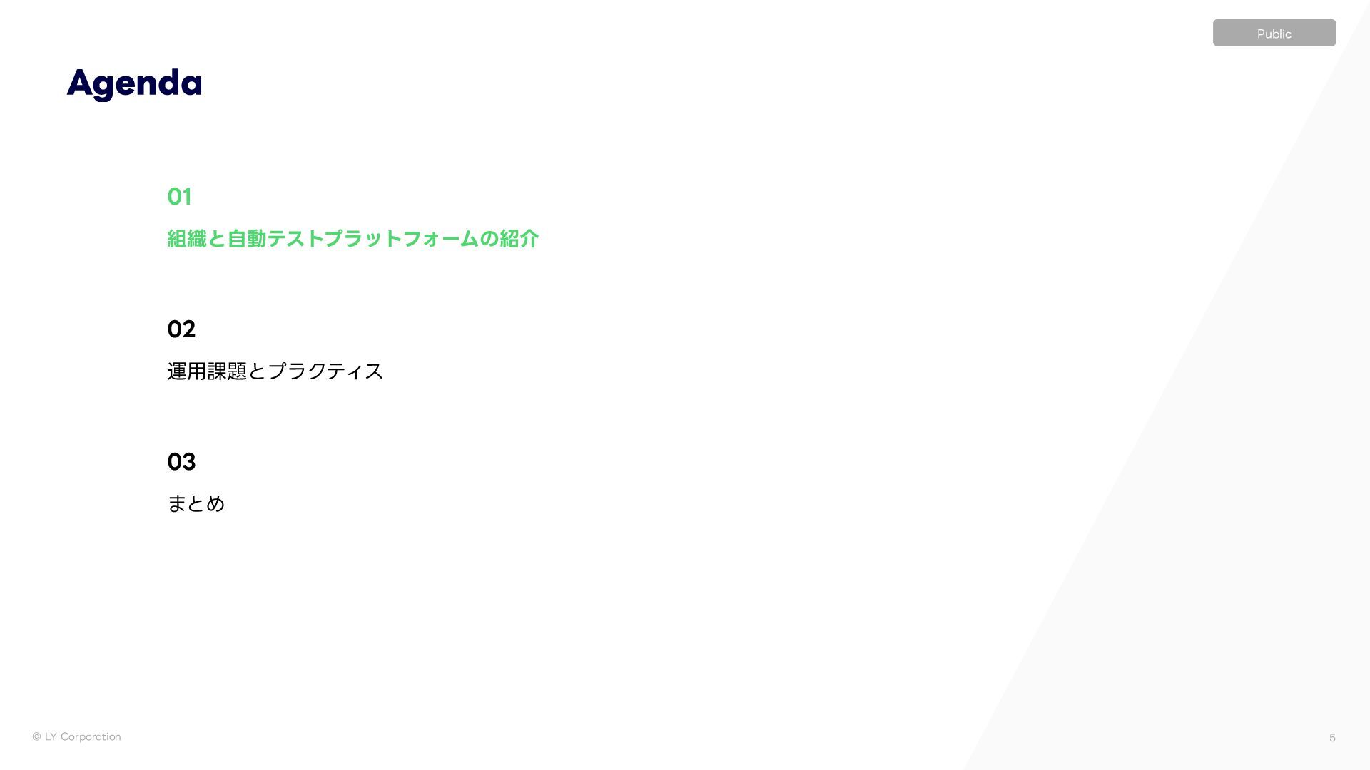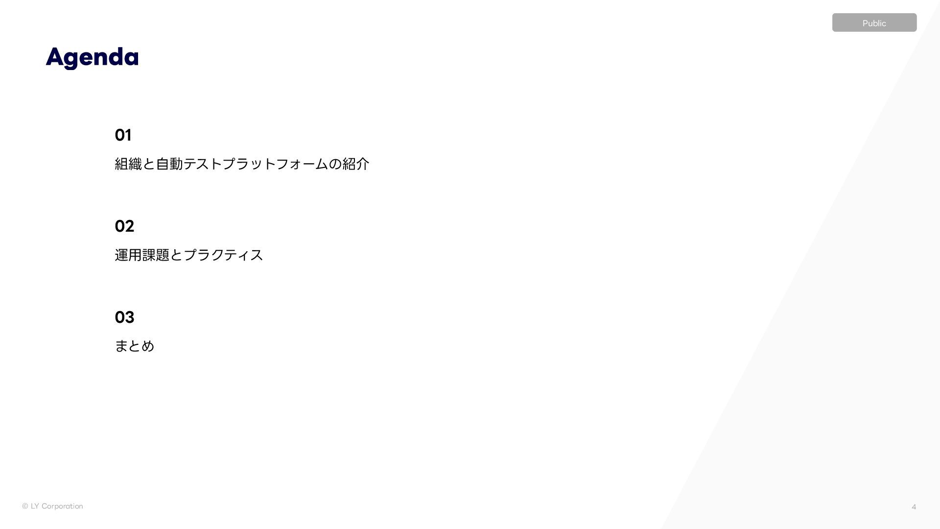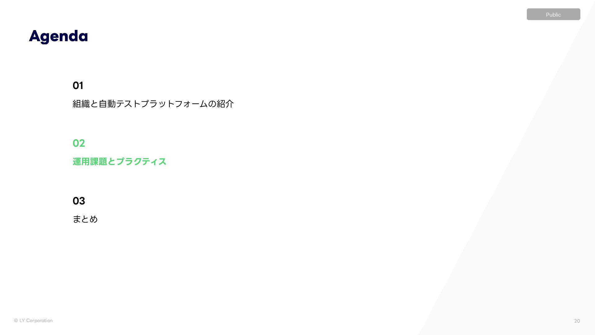 *OUFSOBM6TF0OMZ -:$PSQPSBUJPO 1VCMJD ࠓ͍ͨ͜͠ͱ ◦ QAηϯτϥϧͰӡ༻͍ͯ͠Δશ͚ࣾࣗಈςετϓϥοτϑΥʔϜͷӡ༻࣮ଶ ◦ ϓϥοτϑΥʔϜӡ༻͢Δ͏͑Ͱɺ”େن৫ͳΒͰ”ͷ՝ͱͦͷղܾ