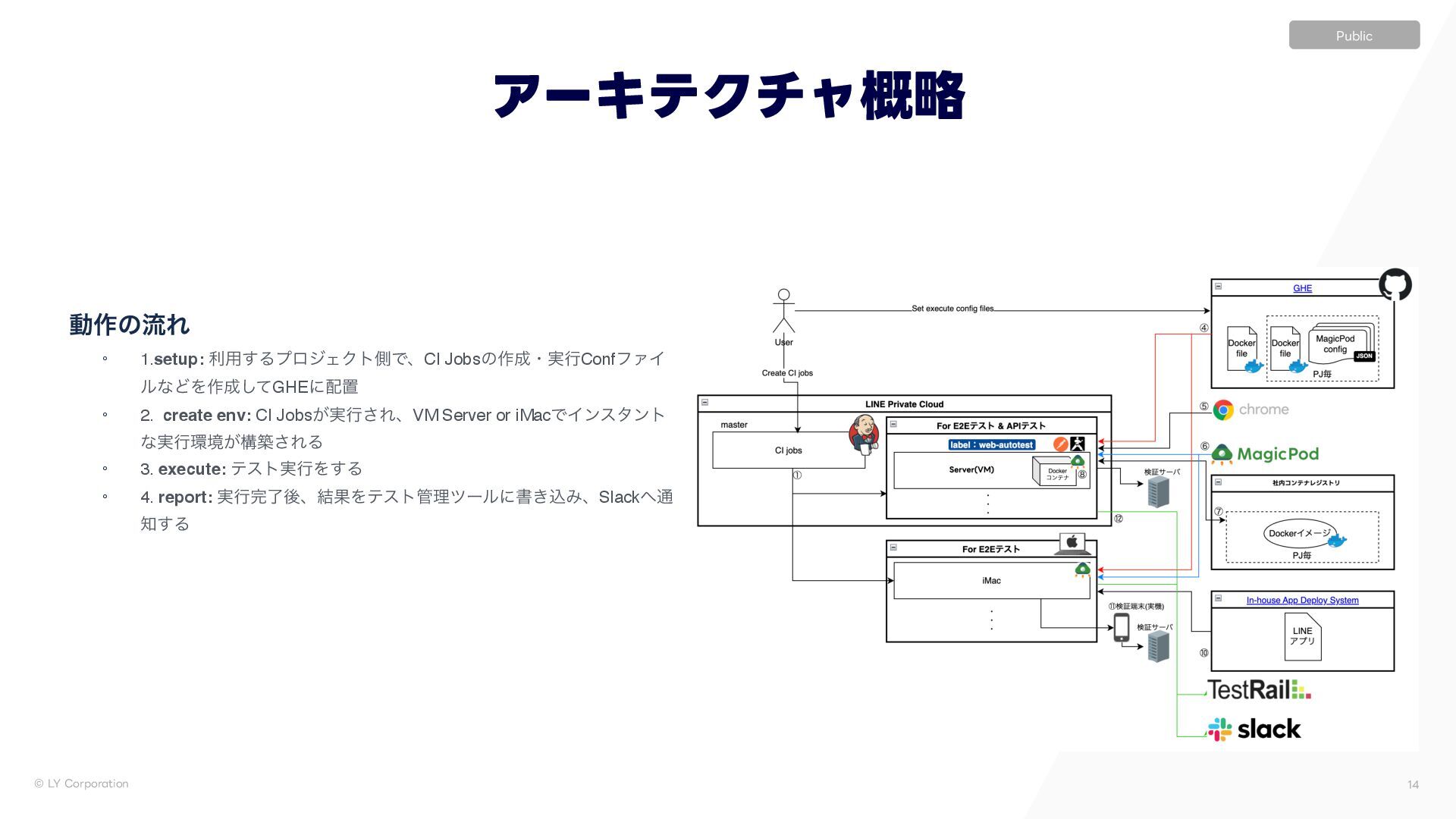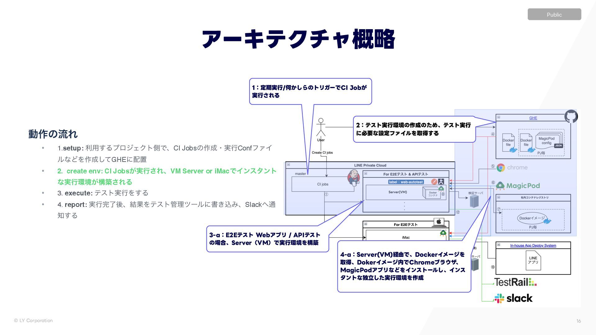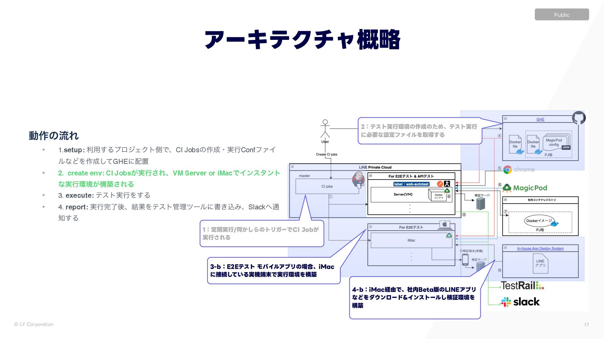ϧͳͲΛ࡞ͯ͠GHEʹஔ ◦ 2. create env: CI Jobs͕࣮ߦ͞ΕɺVM Server or iMacͰΠϯελϯτ ͳ࣮ߦڥ͕ߏங͞ΕΔ ◦ 3. execute: ςετ࣮ߦΛ͢Δ ◦ 4. report: ࣮ߦྃޙɺ݁ՌΛςετཧπʔϧʹॻ͖ࠐΈɺSlack௨ ͢Δ ɿςετ࣮ߦڥͷ࡞ͷͨΊɺςετ࣮ߦ ʹඞཁͳઃఆϑΝΠϧΛऔಘ͢Δ ɿఆظ࣮ߦԿ͔͠ΒͷτϦΨʔͰ$*+PC͕ ࣮ߦ͞ΕΔ Cɿ&&ςετϞόΠϧΞϓϦͷ߹ɺJ.BD ʹଓ͍ͯ͠Δ࣮ػͰ࣮ߦڥΛߏங CɿJ.BDܦ༝Ͱɺࣾ#FUB൛ͷ-*/&ΞϓϦ ͳͲΛμϯϩʔυΠϯετʔϧ͠ݕূڥΛ ߏங