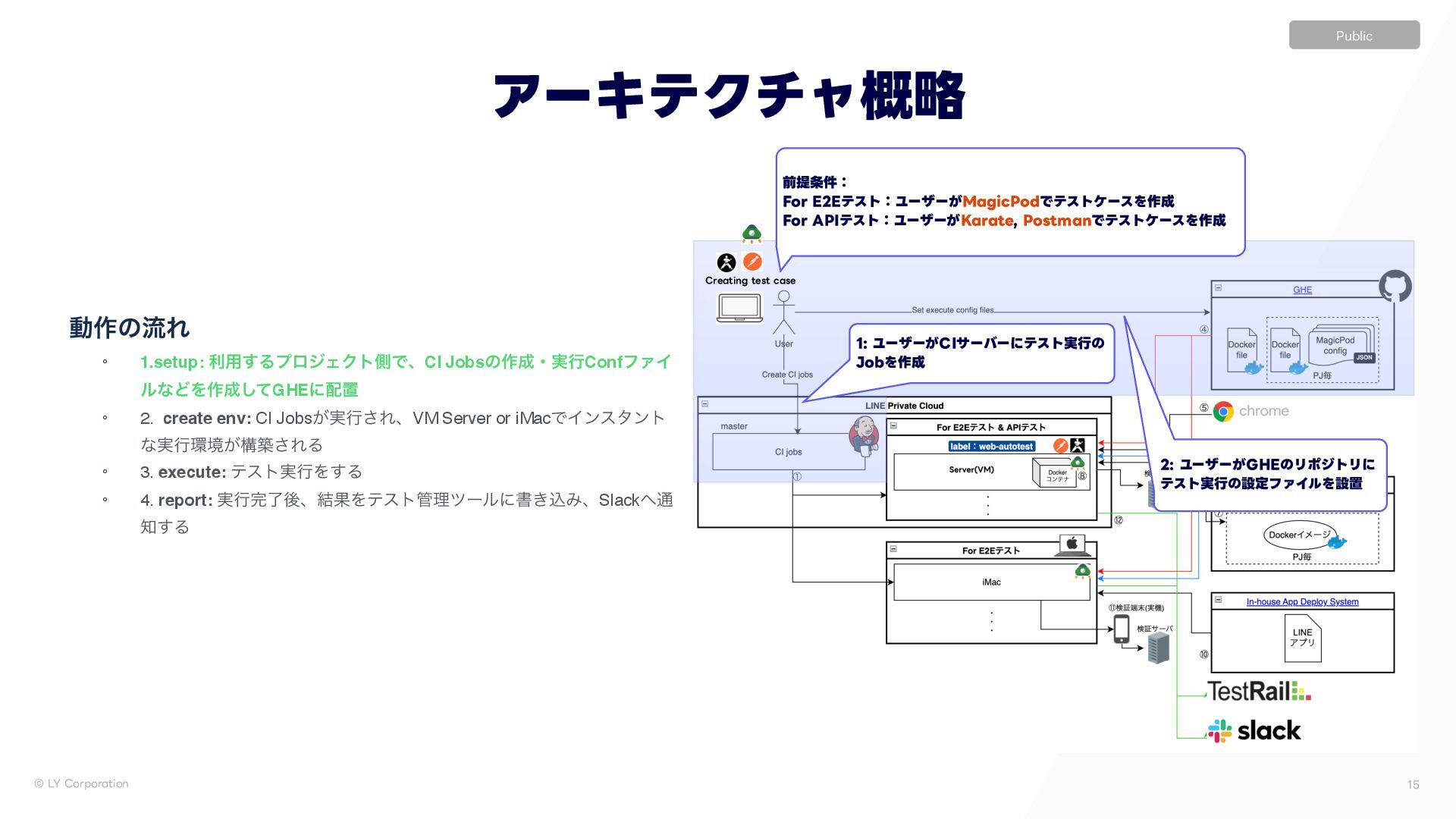 ϧͳͲΛ࡞ͯ͠GHEʹஔ ◦ 2. create env: CI Jobs͕࣮ߦ͞ΕɺVM Server or iMacͰΠϯελϯτ ͳ࣮ߦڥ͕ߏங͞ΕΔ ◦ 3. execute: ςετ࣮ߦΛ͢Δ ◦ 4. report: ࣮ߦྃޙɺ݁ՌΛςετཧπʔϧʹॻ͖ࠐΈɺSlack௨ ͢Δ લఏ݅ɿ 'PS&&ςετɿϢʔβʔ͕.BHJD1PEͰςετέʔεΛ࡞ 'PS"1*ςετɿϢʔβʔ͕,BSBUF 1PTUNBOͰςετέʔεΛ࡞ Ϣʔβʔ͕$*αʔόʔʹςετ࣮ߦͷ +PCΛ࡞ Ϣʔβʔ͕()&ͷϦϙδτϦʹ ςετ࣮ߦͷઃఆϑΝΠϧΛઃஔ $SFBUJOHUFTUDBTF