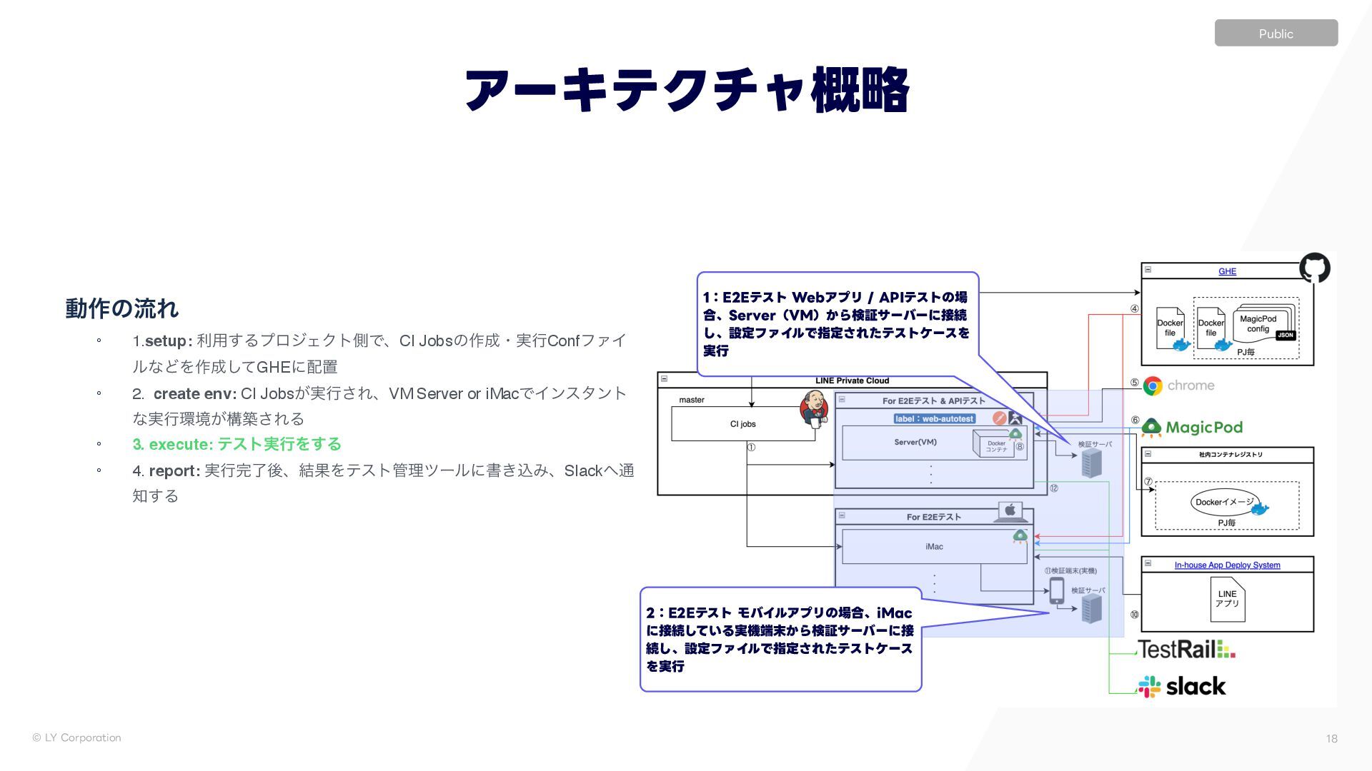 ϧͳͲΛ࡞ͯ͠GHEʹஔ ◦ 2. create env: CI Jobs͕࣮ߦ͞ΕɺVM Server or iMacͰΠϯελϯτ ͳ࣮ߦڥ͕ߏங͞ΕΔ ◦ 3. execute: ςετ࣮ߦΛ͢Δ ◦ 4. report: ࣮ߦྃޙɺ݁ՌΛςετཧπʔϧʹॻ͖ࠐΈɺSlack௨ ͢Δ ɿ&&ςετϞόΠϧΞϓϦͷ߹ɺJ.BD ʹଓ͍ͯ͠Δ࣮ػ͔Βݕূαʔόʔʹ ଓ͠ɺઃఆϑΝΠϧͰࢦఆ͞Εͨςετέʔε Λ࣮ߦ ɿ&&ςετ8FCΞϓϦ"1*ςετͷ ߹ɺ4FSWFSʢ7.ʣ͔Βݕূαʔόʔʹଓ ͠ɺઃఆϑΝΠϧͰࢦఆ͞ΕͨςετέʔεΛ ࣮ߦ