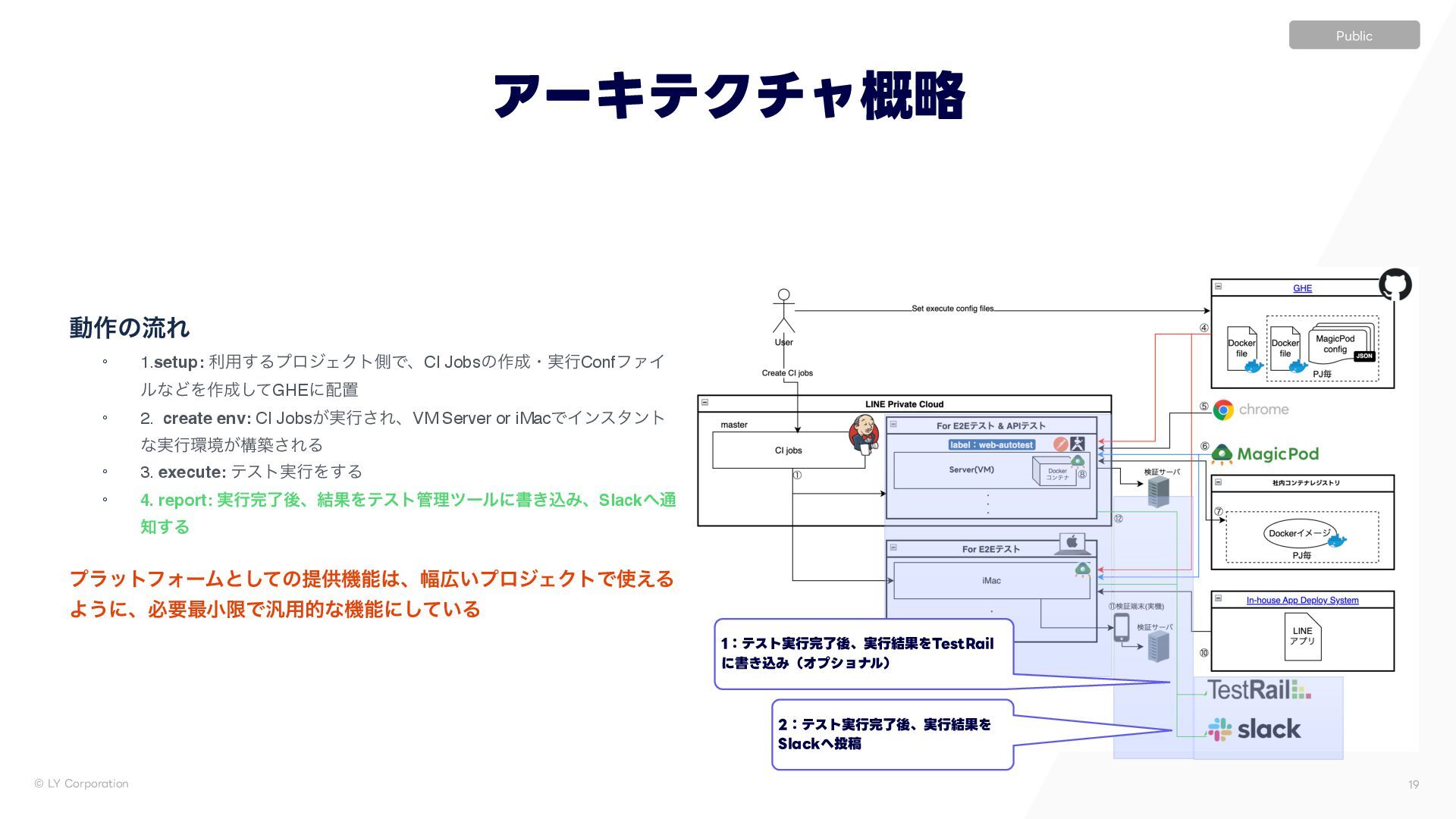 ϧͳͲΛ࡞ͯ͠GHEʹஔ ◦ 2. create env: CI Jobs͕࣮ߦ͞ΕɺVM Server or iMacͰΠϯελϯτ ͳ࣮ߦڥ͕ߏங͞ΕΔ ◦ 3. execute: ςετ࣮ߦΛ͢Δ ◦ 4. report: ࣮ߦྃޙɺ݁ՌΛςετཧπʔϧʹॻ͖ࠐΈɺSlack௨ ͢Δ ϓϥοτϑΥʔϜͱͯ͠ͷఏڙػೳɺ෯͍ϓϩδΣΫτͰ͑Δ Α͏ʹɺඞཁ࠷খݶͰ൚༻తͳػೳʹ͍ͯ͠Δ ɿςετ࣮ߦྃޙɺ࣮ߦ݁ՌΛ5FTU3BJM ʹॻ͖ࠐΈʢΦϓγϣφϧʣ ɿςετ࣮ߦྃޙɺ࣮ߦ݁ՌΛ 4MBDLߘ
