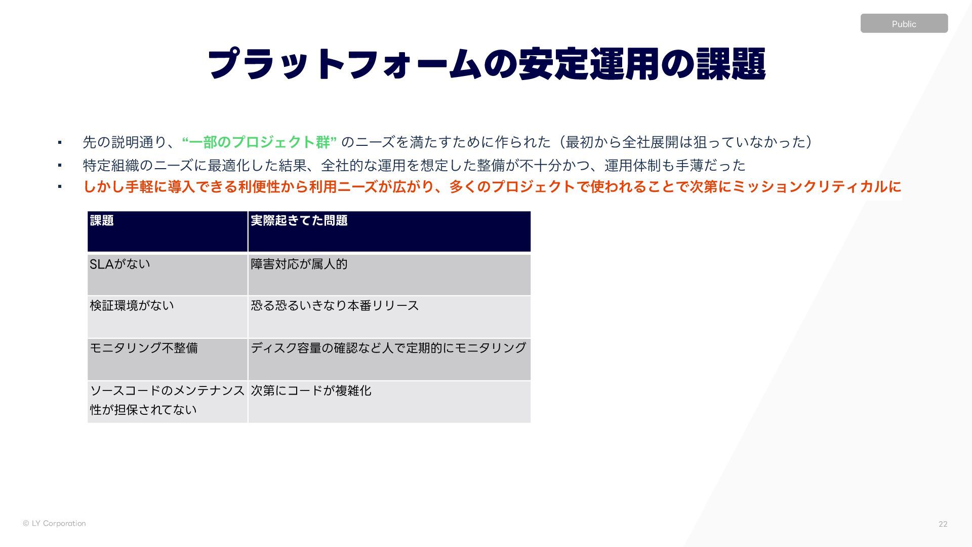 *OUFSOBM6TF0OMZ -:$PSQPSBUJPO 1VCMJD ϓϥοτϑΥʔϜͷ҆ఆӡ༻ͷ՝ ▪ ઌͷઆ໌௨Γɺ“Ұ෦ͷϓϩδΣΫτ܈” ͷχʔζΛຬͨͨ͢Ίʹ࡞ΒΕͨʢ࠷ॳ͔Βશࣾల։ૂ͍ͬͯͳ͔ͬͨʣ ▪ ಛఆ৫ͷχʔζʹ࠷దԽͨ݁͠Ռɺશࣾతͳӡ༻Λఆͨ͠උ͕ෆे͔ͭɺӡ༻ମ੍खബͩͬͨ