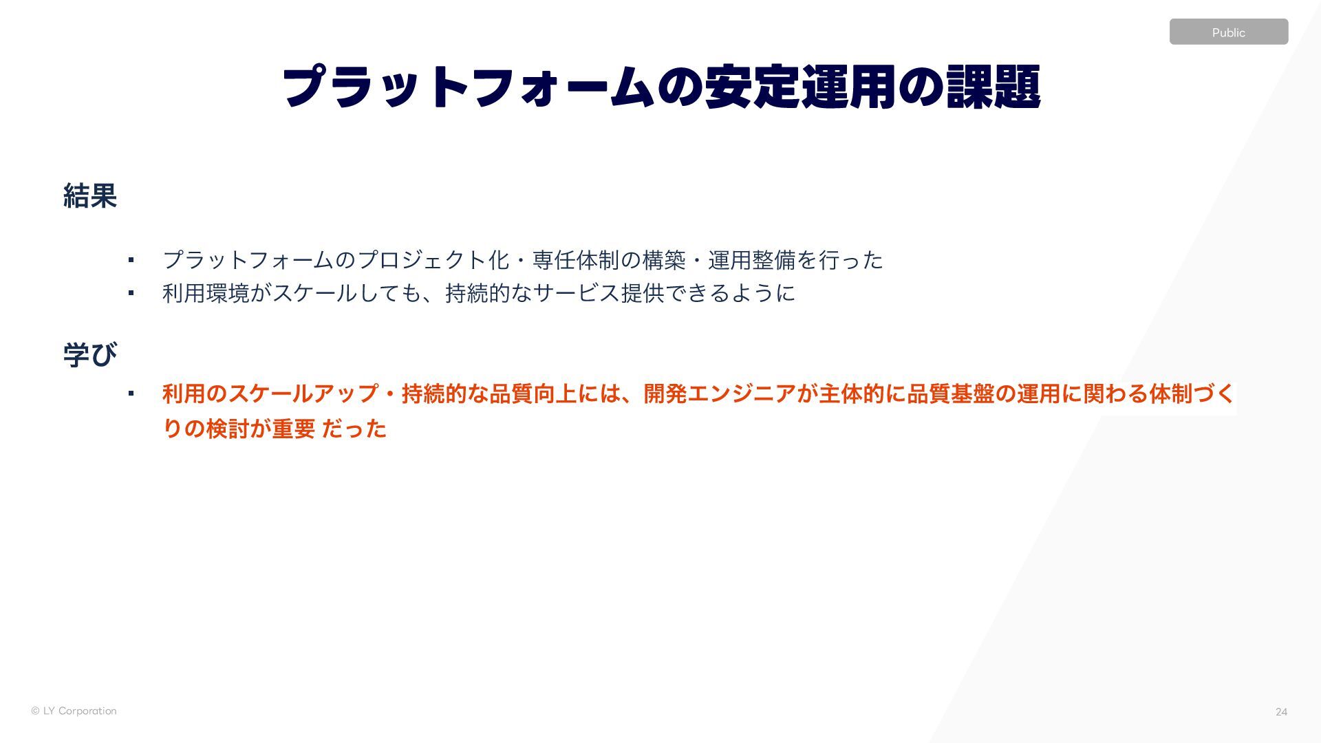 *OUFSOBM6TF0OMZ -:$PSQPSBUJPO 1VCMJD ϓϥοτϑΥʔϜͷ҆ఆӡ༻ͷ՝ ରࡦ ▪ ࠓޙͷར༻χʔζΛߟ͑ɺϓϥοτϑΥʔϜͷϓϩδΣΫτԽ͠ɺ։ൃΤϯδχΞʢSQEʣ͕ӡ༻ཧ͢Δମ੍ʹҠߦ ▪ ӡ༻ϧʔϧͷඋਐΊͨ