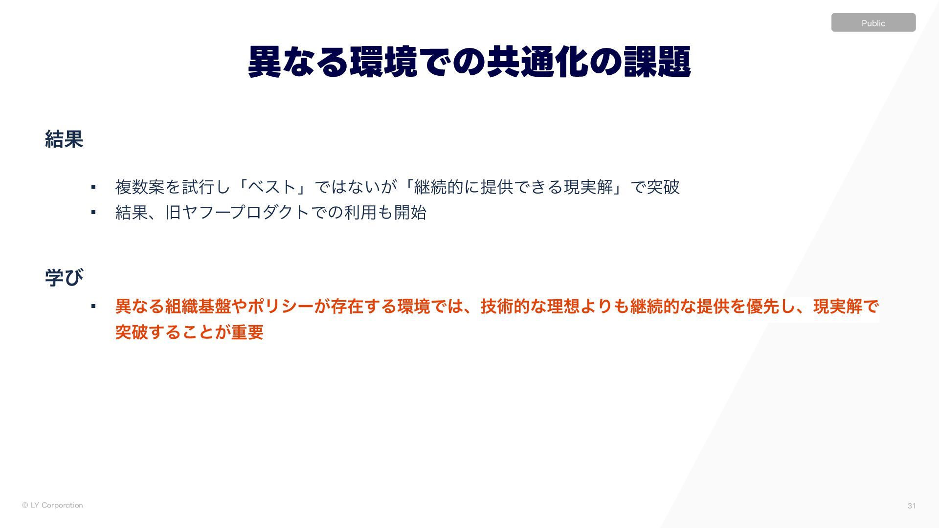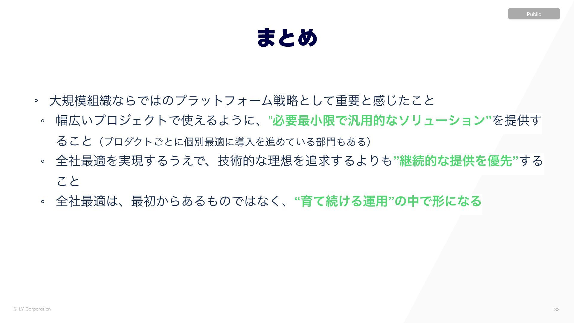 *OUFSOBM6TF0OMZ -:$PSQPSBUJPO 1VCMJD ·ͱΊ ◦ େن৫ͳΒͰͷϓϥοτϑΥʔϜઓུͱͯ͠ॏཁͱײͨ͜͡ͱ ◦ ෯͍ϓϩδΣΫτͰ͑ΔΑ͏ʹɺ”ඞཁ࠷খݶͰ൚༻తͳιϦϡʔγϣϯ”Λఏڙ͢ Δ͜ͱʢϓϩμΫτ͝ͱʹݸผ࠷దʹಋೖΛਐΊ͍ͯΔ෦͋Δʣ