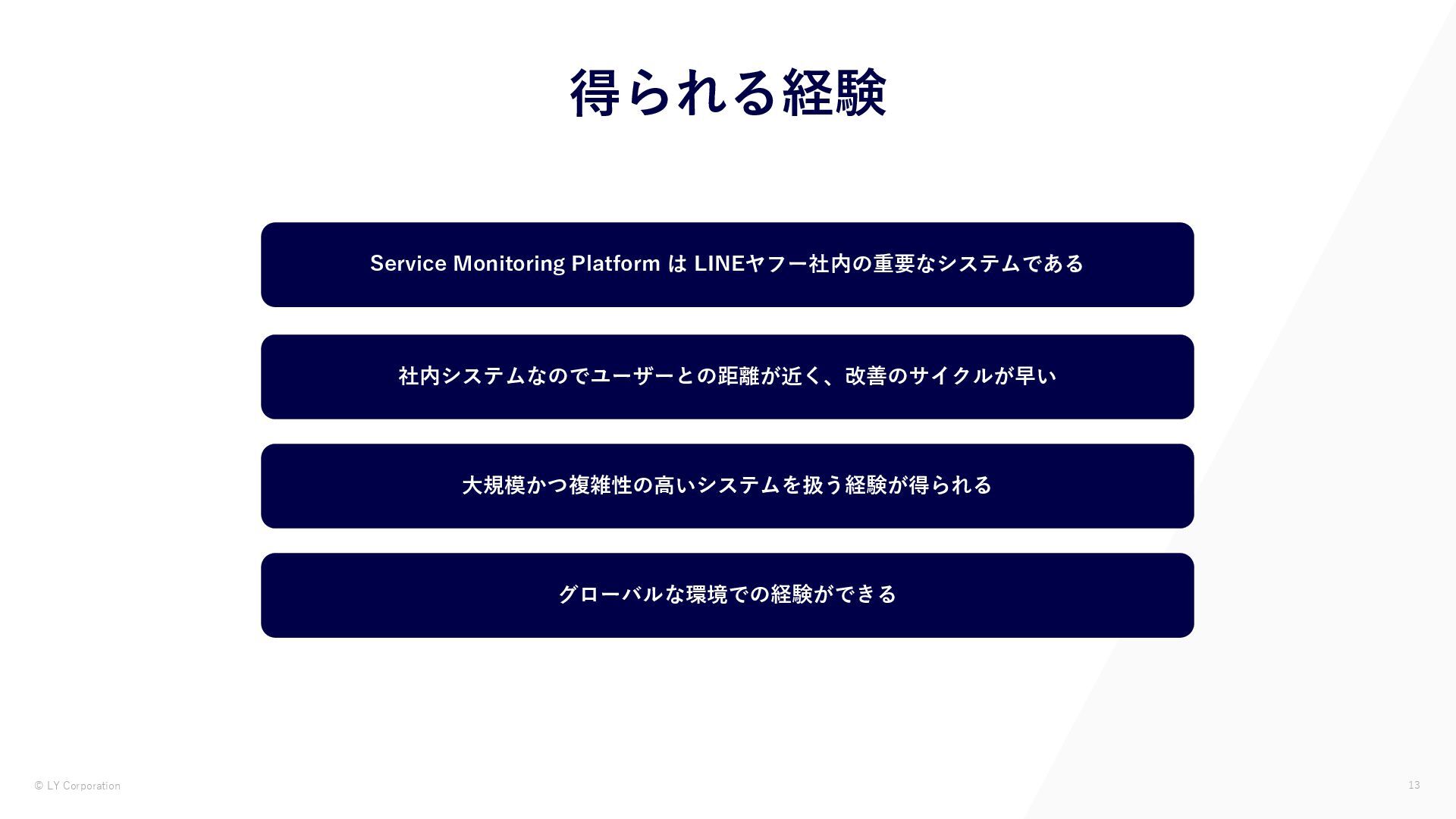 © LY Corporation Internal Use Only 13 得られる経験 Service Monitoring