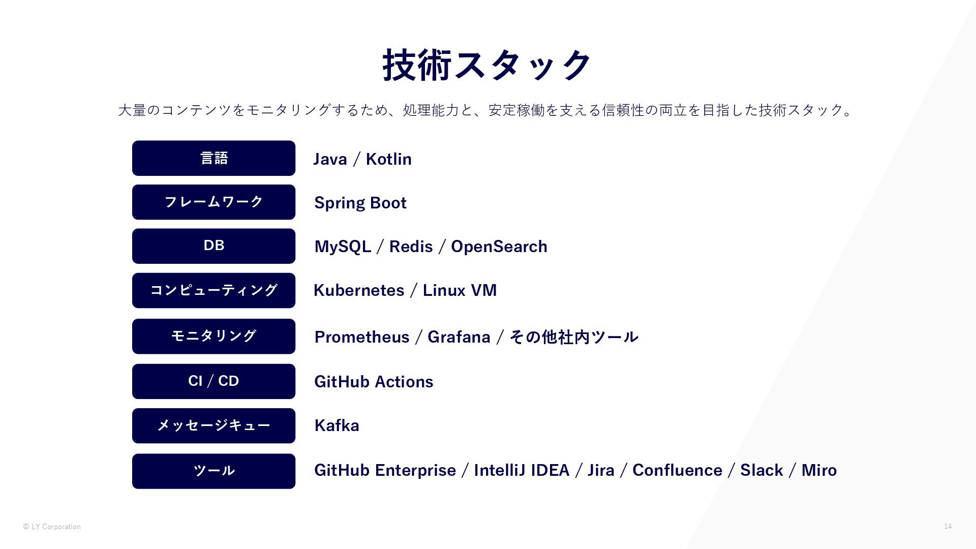 © LY Corporation Internal Use Only 14 技術スタック 大量のコンテンツをモニタリングするため、処理能力と、安定稼働を支える信頼性の両立を目指した技術スタック。 言語