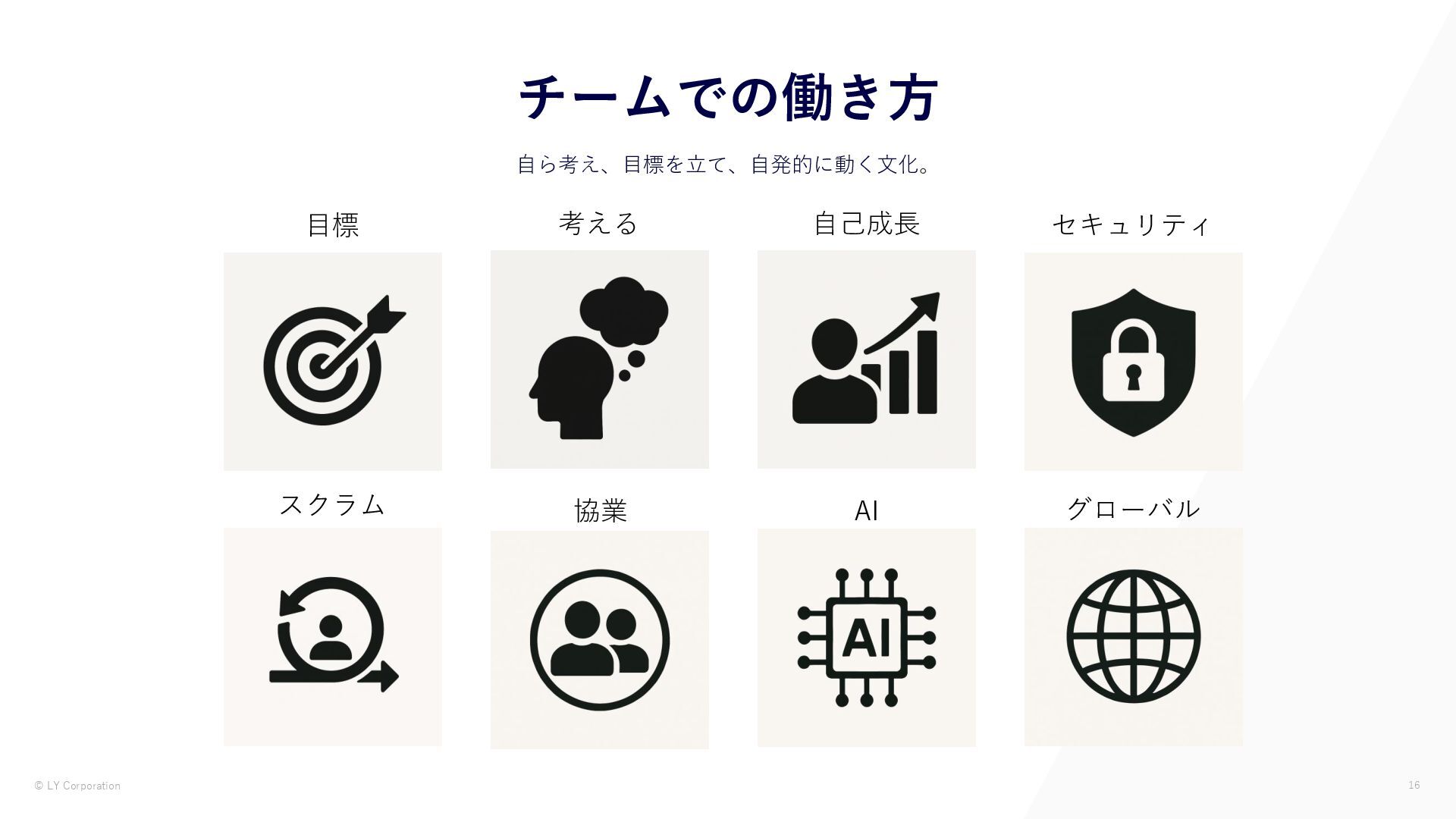 © LY Corporation Internal Use Only 16 チームでの働き方 自ら考え、目標を立て、自発的に動く文化。 目標