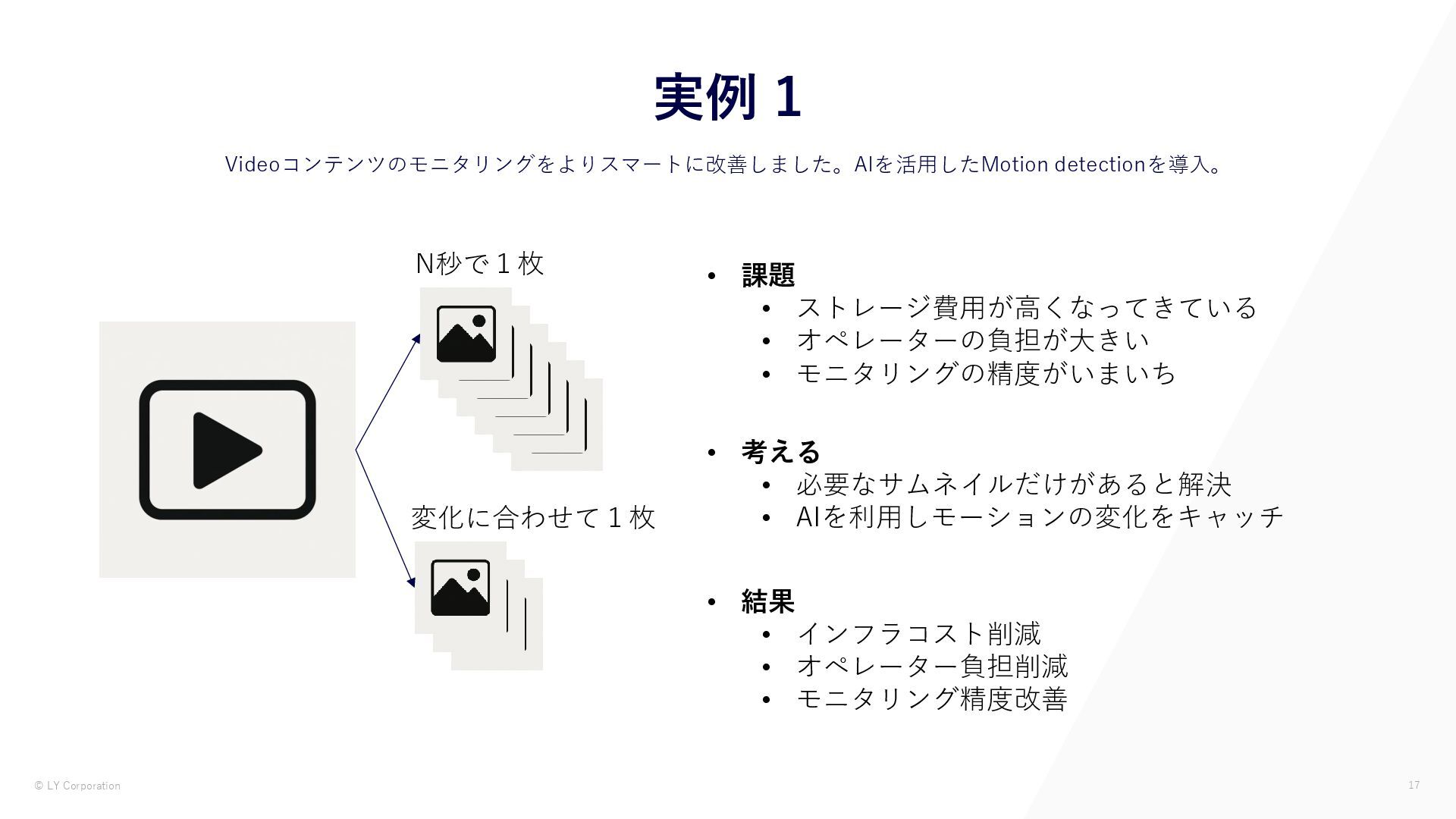 © LY Corporation Internal Use Only 17 実例 1 Videoコンテンツのモニタリングをよりスマートに改善しました。AIを活用したMotion