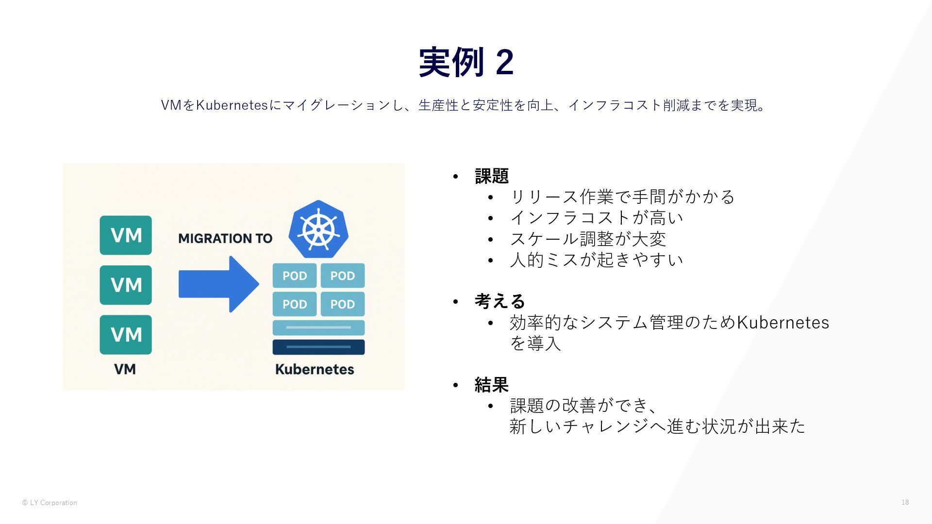 © LY Corporation Internal Use Only 18 実例 2 VMをKubernetesにマイグレーションし、生産性と安定性を向上、インフラコスト削減までを実現。