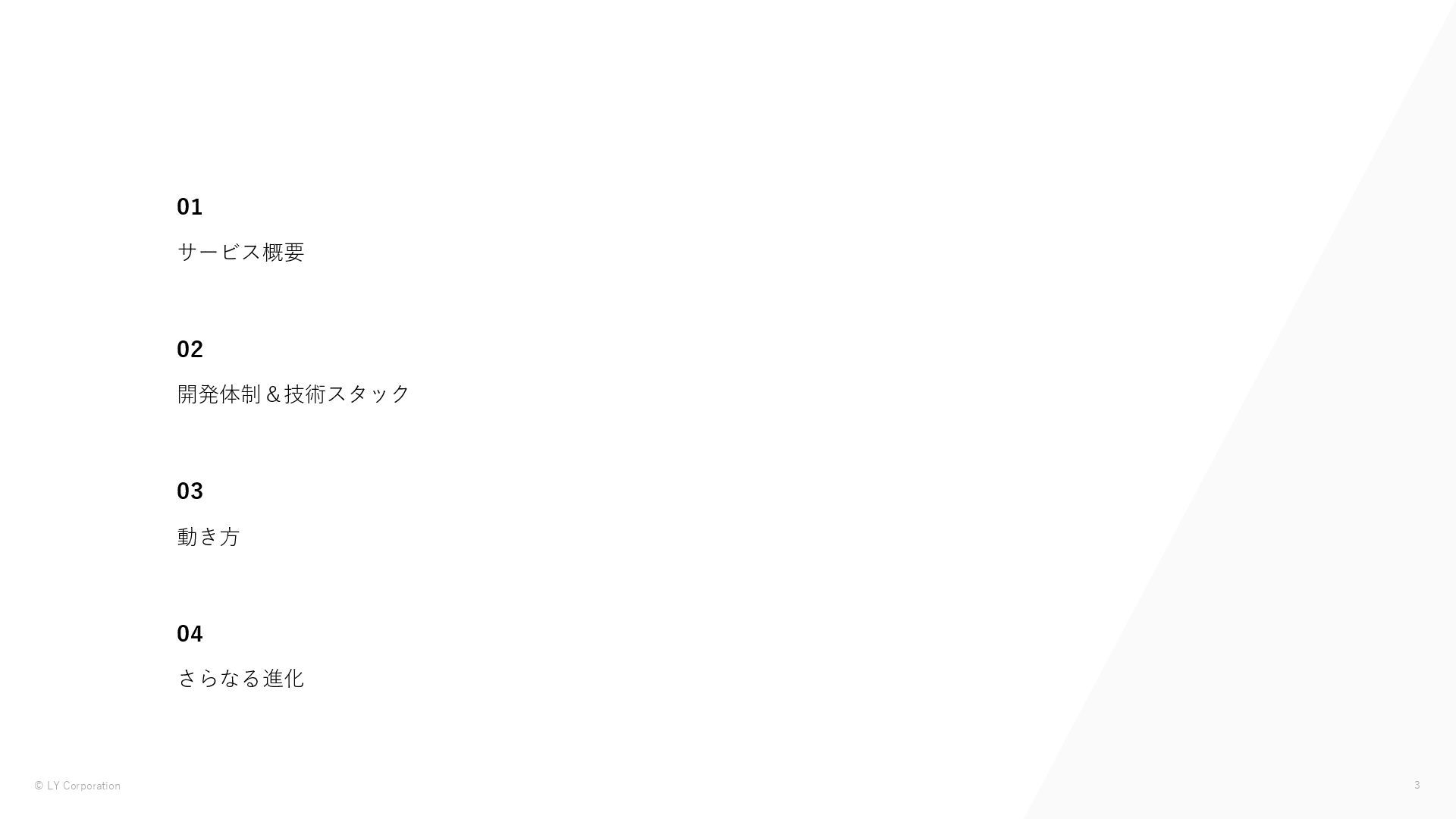 © LY Corporation Internal Use Only 01 サービス概要 02 開発体制&技術スタック