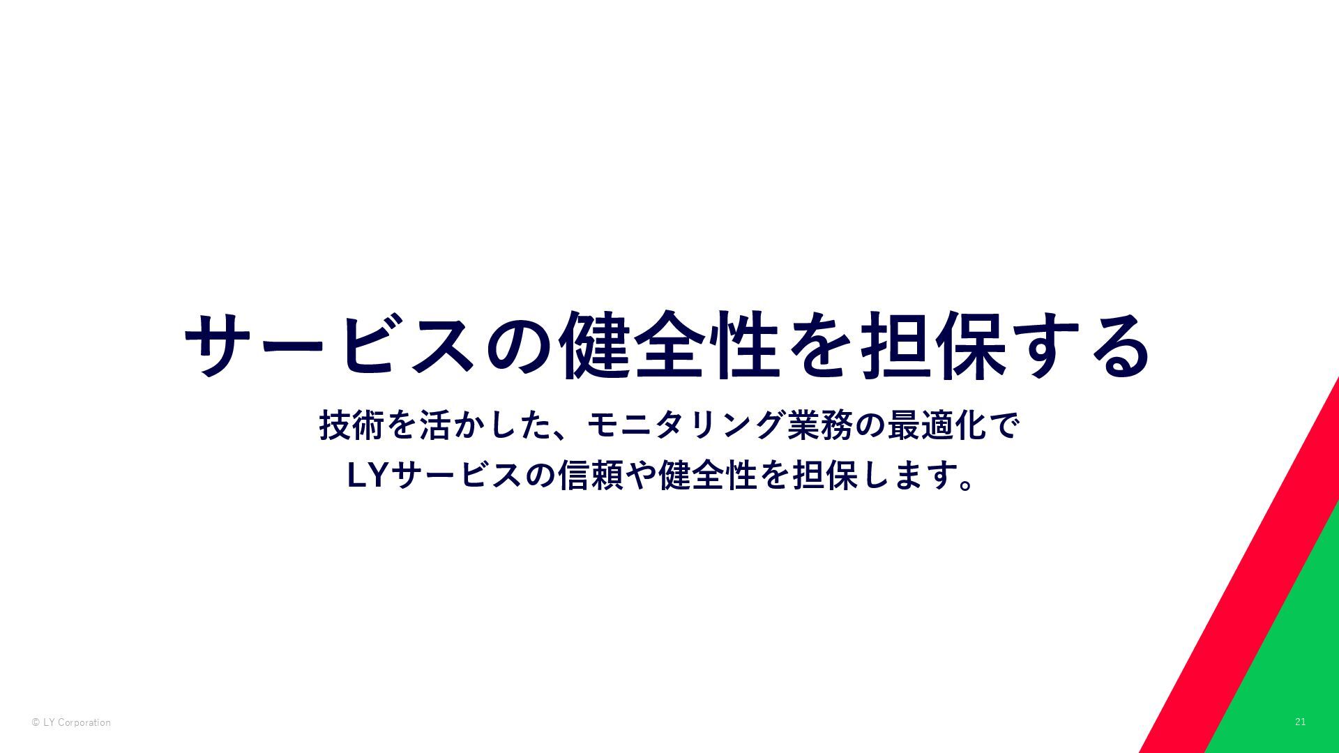 © LY Corporation Internal Use Only サービスの健全性を担保する 技術を活かした、モニタリング業務の最適化で LYサービスの信頼や健全性を担保します。 21