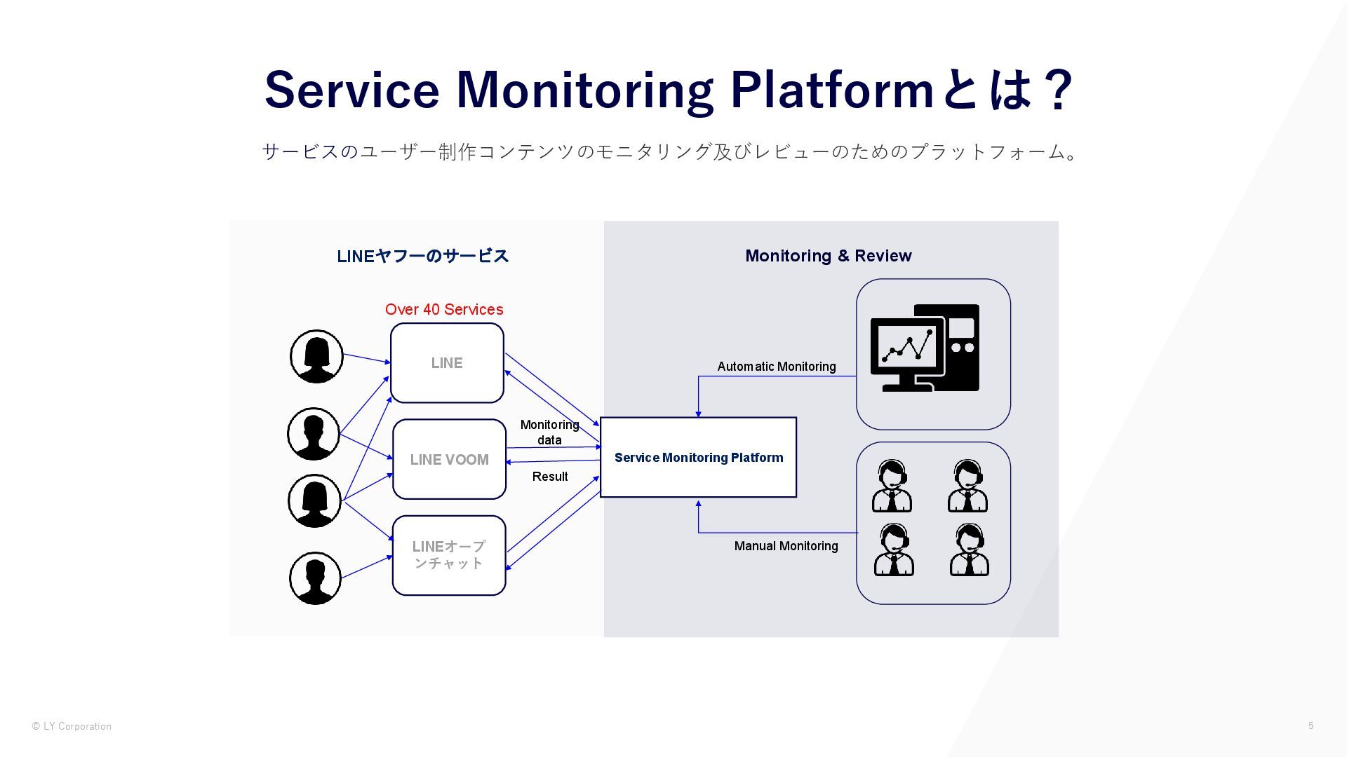 サービスのユーザー制作コンテンツのモニタリング及びレビューのためのプラットフォーム。 LINEヤフーのサービス Service Monitoring Platform LINE Monitoring & Review LINE VOOM LINEオープ ンチャット Monitoring data Result Automatic Monitoring Manual Monitoring Over 40 Services