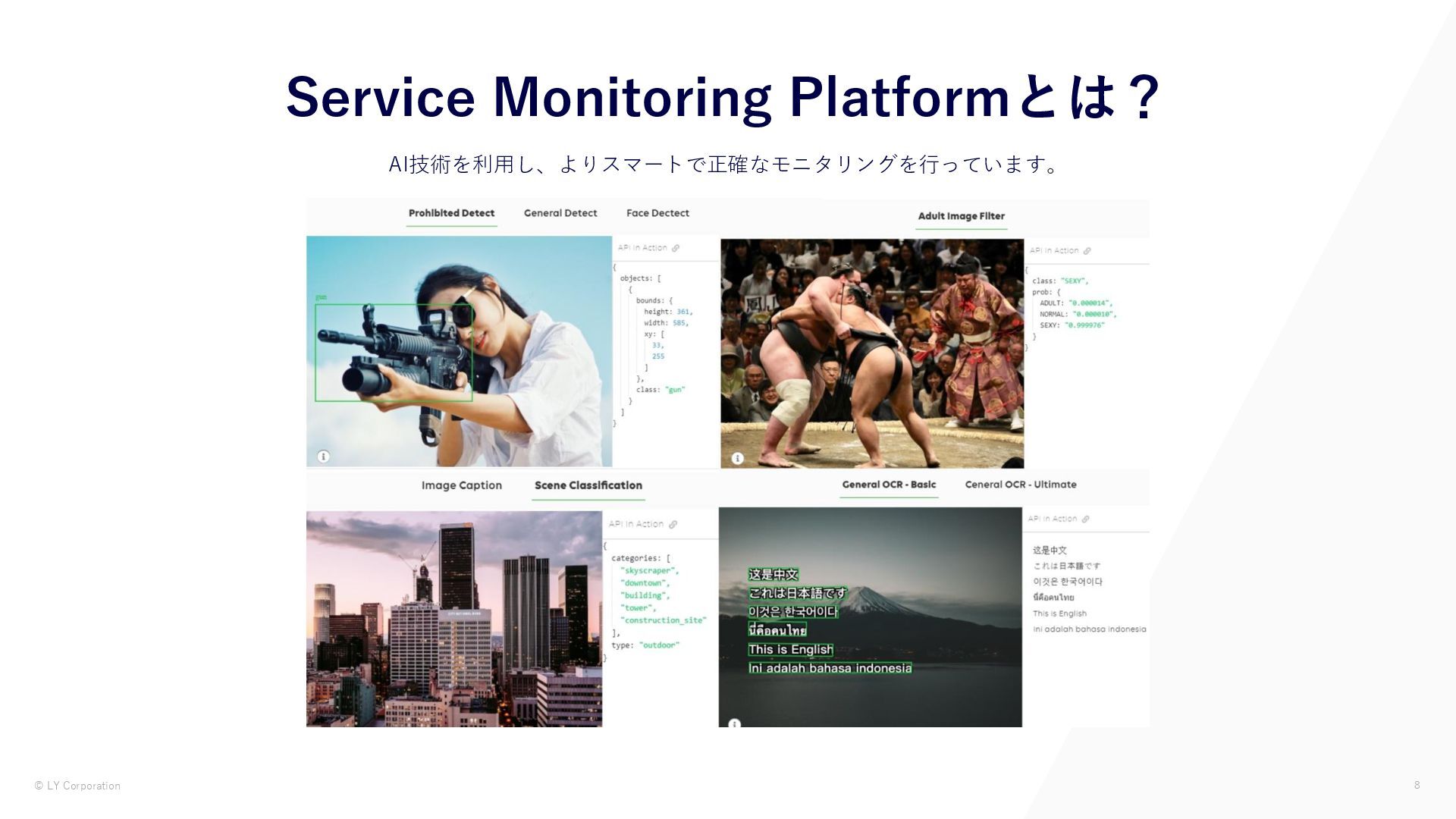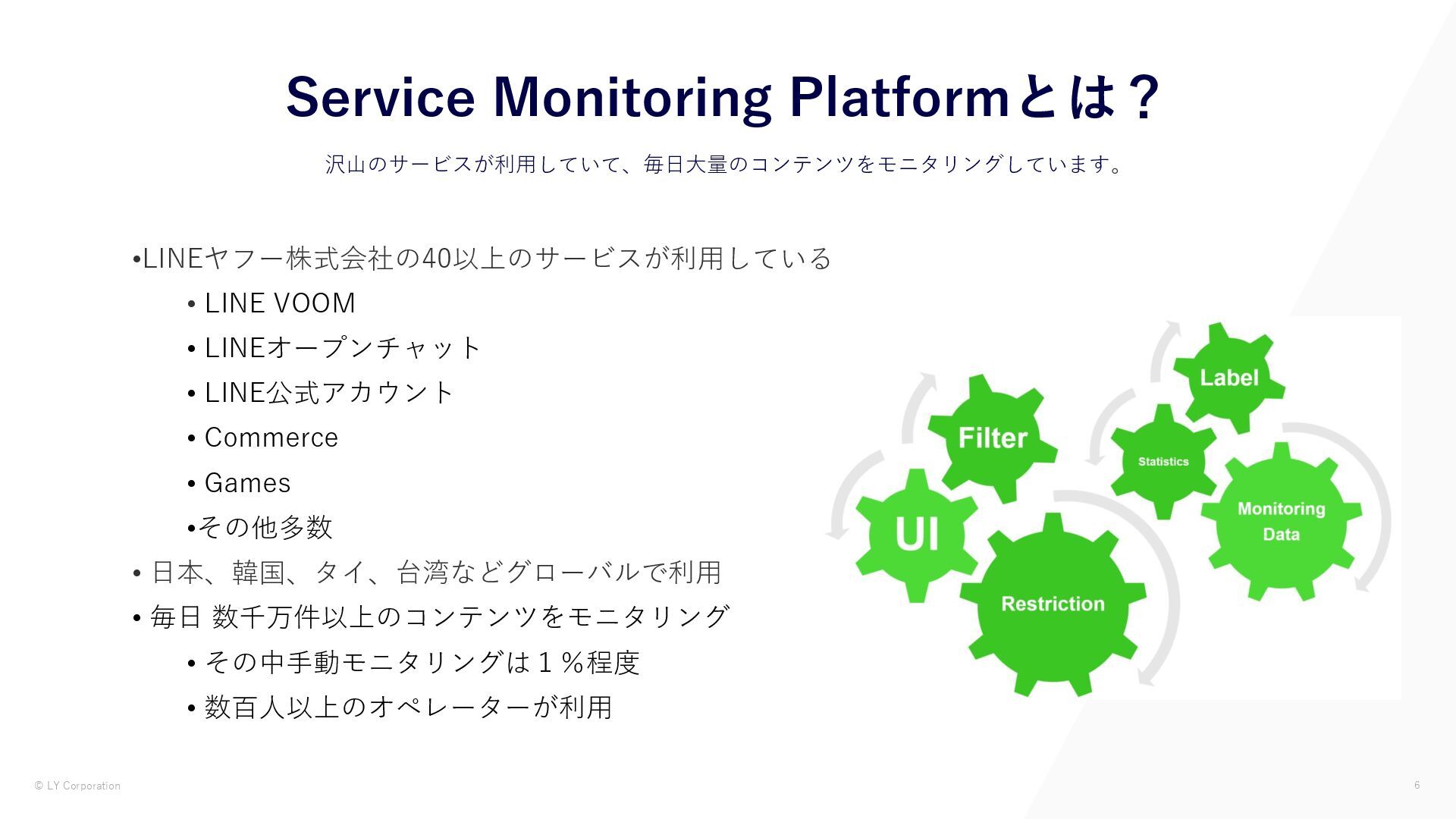 沢山のサービスが利用していて、毎日大量のコンテンツをモニタリングしています。 •LINEヤフー株式会社の40以上のサービスが利用している • LINE VOOM • LINEオープンチャット • LINE公式アカウント • Commerce • Games •その他多数 • 日本、韓国、タイ、台湾などグローバルで利用 • 毎日 数千万件以上のコンテンツをモニタリング • その中手動モニタリングは1%程度 • 数百人以上のオペレーターが利用